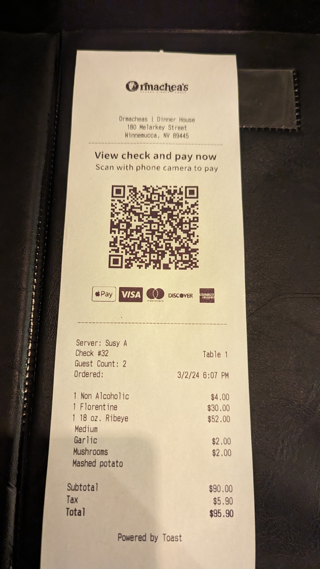 We read about Ormachea's Basque on-line. Practically drooling over their prime rib. So when we are staying over at Minnemucca, we went there and tried it out. Unfortunately we arrived on a Tuesday and they only serve prime ribs over the weekends. So I ordered the ribeye, and my wife ordered the stuffed chicken breast with fettucine. Both items were outstanding. The ribeye was super tender, well marinated, and grilled to perfection. It was smothered with sauteed onion, mushroom and roasted garlic bites. The roasted garlic absolutely took the dish over the top. I struggled mightily and finished the superb steak. Two thumbs up. The stuffed chicken breast was very moist, well seasoned, and really tender. Usually chicken dishes are quite boring. They have very unique spices that makes this dish exciting. Not an easy feat. Overall, 5 stars are well earned. Really happy we stopped...