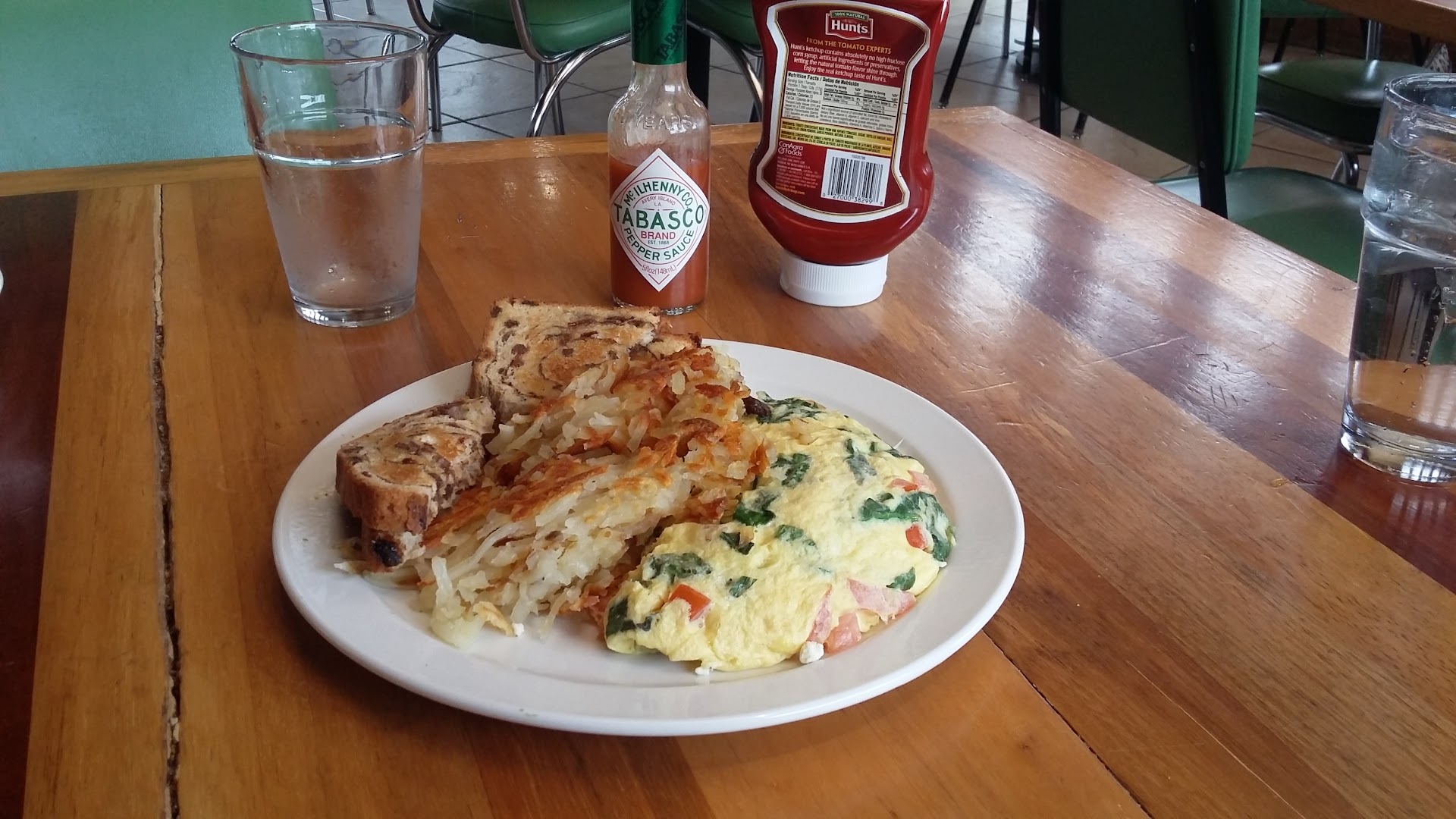 This place looks like it may be a local favorite. When I went there to eat a little after 11 a.m., it was packed and I could barely find a place to park. It is on the main drag in Winnemucca so, if you are traveling, it is easy to find when you get off the freeway. Just keep going straight down Winnemucca Boulevard. The interior of the restaurant is done in wood paneling and period lamps, many of them featuring stained glass. It is a pleasant environment, though I did not find the chairs particularly comfortable on my bad back. Will try a booth next time. There are two dining rooms, plus outdoor dining, so there appears to be plenty of seating. The Griddle is only open until 2 p.m. everyday. They specialize in breakfast and lunch and give you both menus to peruse. There is a wide selection of breakfast foods, of course, including waffles, French toast, pancakes, and all manner of eggs and omelettes. They also have burgers and salads. They even have some interesting looking things like Benedictine on crab cakes. They also make many of their items, including the blueberry muffins, from scratch. Unfortunately, there are no vegan options in this place (well, maybe a salad) & no meat substitutes, such as veggie burger. I ordered an omelette with spinach, feta cheese, and tomatoes. It came with hash browns and an option of seven different kinds of bread. I went with the cinnamon raisin bread. How often do you get that at a restaurant? The slices were very small but it was a nice change. The omelet and hash browns were also delicious, though I felt the omelet was missing something. The service at this restaurant was very nice. A waitress who was not even on my table noticed I was out of water and brought me a fresh (and larger) glass. Overall, I would definitely recommend this restaurant for most people. I took off one star for the lack of vegetarian options. Other than that, I found this place highly satisfactory for...