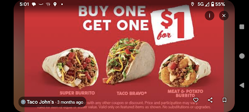Read moreTraveling thru town we found TJ on Google Maps. They had BOGO $1 super burritos on Maps. I showed this to the server and was told it's no good. Why is it Advertised if it's not good? We also asked for no onions. It states on receipt No onion but both burritos had onions! The food was ok, but I would not recommend this fast food after all this aggravation. They should have authorized this deal then report it to the owner & make our food as ordered without onions. Instead they get a negative review. We usually love TJs and stop there to eat...