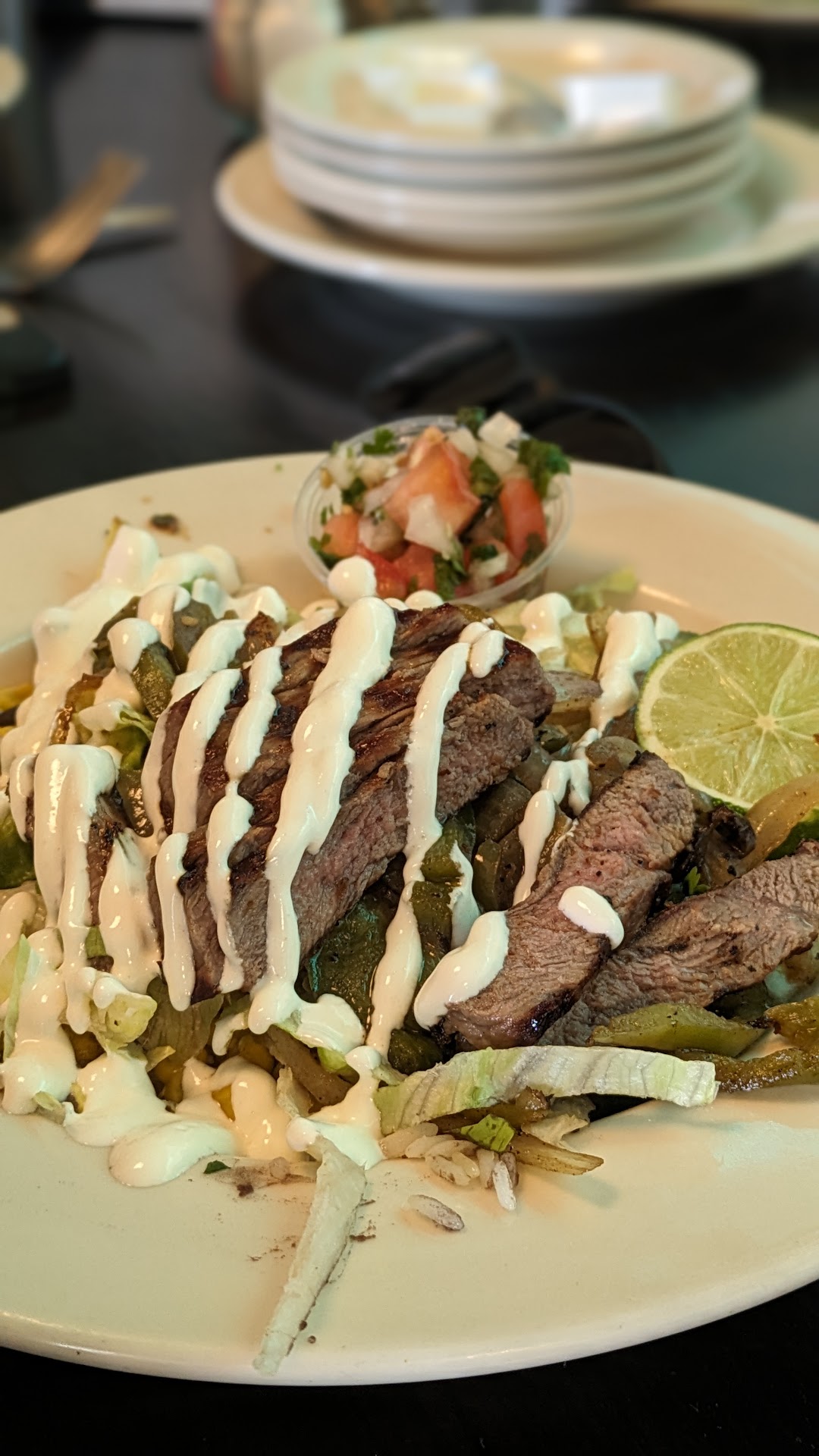 However, the main dish that I ordered, a salad, should not have been that difficult to do. I could have ordered something else but felt comfortable more so with this at that time. The NY strip on top was flavorless, tough, threaded with tough fat twine, and definitely not quality from local farms. It was the smallest piece of beef I've seen, lucky if it was nearly 2 oz., and appeared microwaved in color.