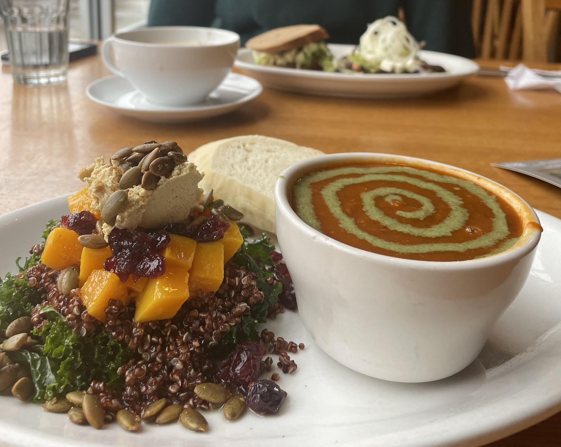 The inside if this place is filled with plants 😄 and they're all so healthy. The food is delicious, the staff are super friendly every time my boyfriend and I go. Their menu changes slightly pretty regularly, but I honestly think that's cooler than having one super massive menu with everything on it. This means that their food is always made with fresh ingredients, and trust me, you can tell. Speaking of fresh, their fresh bread is to die for!!! It comes with their chili which is heavenly and I believe vegetarian. It's a perfect little restaurant and such a refreshing change from greasy breakfast food, like Perkins 😬. The ONLY downside is they have some really strange hours. If you get the chance, you NEED to check...
