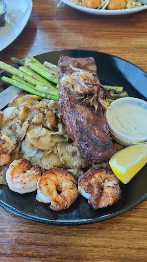 Cute restaurant right along the river and basically in the park. Very near the bridge. Pretty decent food but it's basically self-service. Here's a pros and cons list: Pros: -Great fish Tacos! My boyfriend said they are the best he has ever had. -inside and outside seating -Tables are spaced out well (they look close together but when you actually sit down you can't hear the other tables) -chef was very accommodating (I can't have batter right now and they seared and beautifully seasoned my shrimp) -great place if you want to be by the river -food seemed super fast for everyone (my steak took awhile)