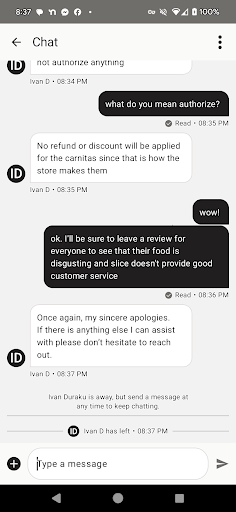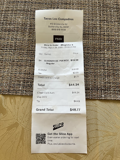 Ā Ā Ā Read moreOrdered today from slice and I will say I will never order food from here again. I ordered pork carnitas, birrira tacos and their guac and chips The only thing really edible were the birrira tacos. The chips while homemade were ok, the guacamole was not guacamole but more like an avocado crema with a spicy kick. The pork carnitas were disgusting. I took one bite and spit it out. They were greasy and did not taste right. .. completely inedible. I reached out to slice since I ordered from them and they came back saying that the restaurant says that's how the carnitas come... That they come greasy and will not authorize a refund. I have the screen shots from the chat with slice that I'll post. Horrible customer service on both the restaurant and slices behalf. I will NEVER ORDER FROM HERE AGAIN. AND WOULD NOT RECOMMEND! It's a shame as I love Mexican food and this restaurant is very close to my house but I just spent $44 on food that taco bell beats....