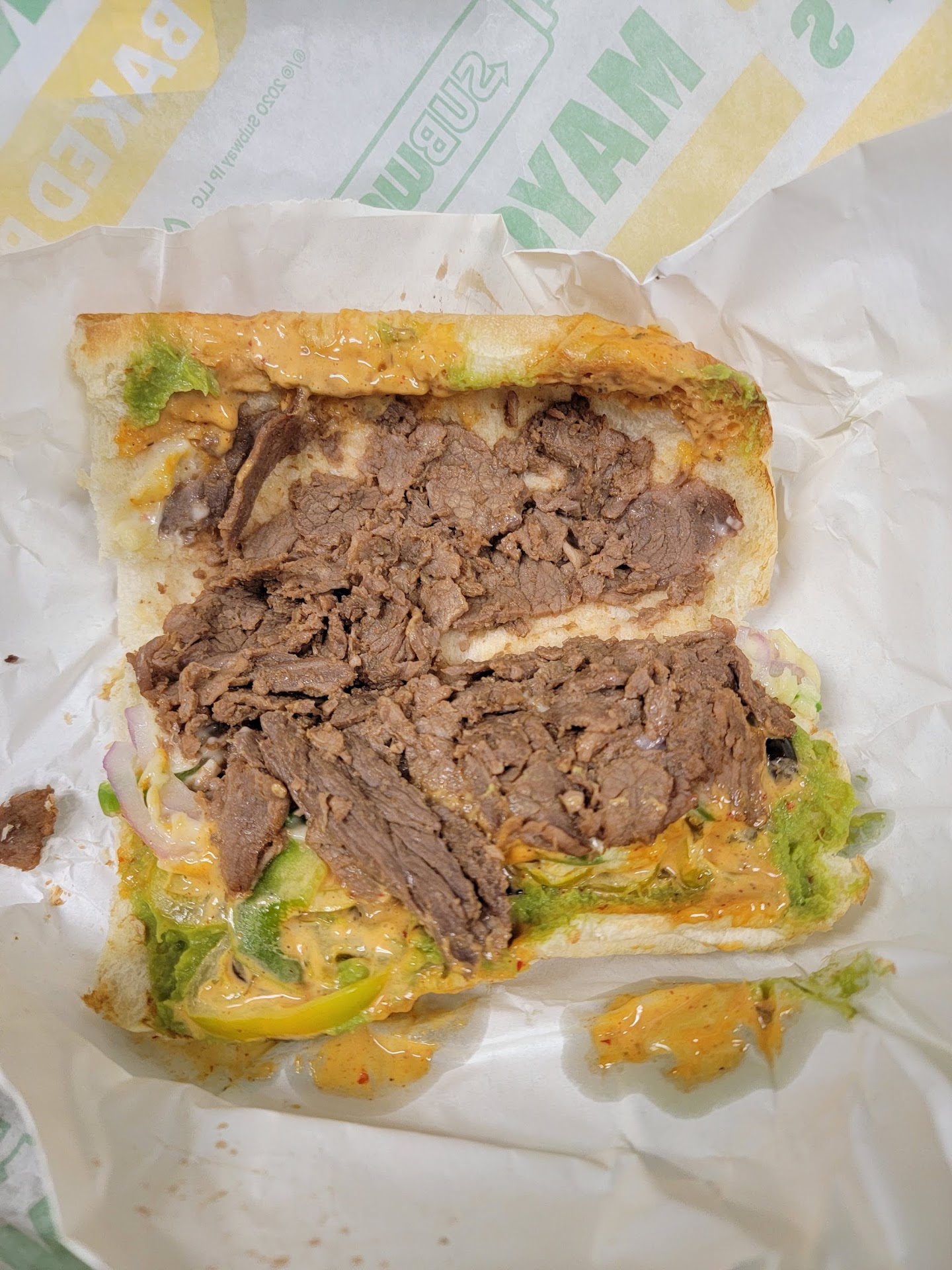 Entering the store i noticed multiple dirty tables. It was not busy by any means when I was here. I was the only person in line and 2 tables in the store were occupied. I could see behind the food counter there was garbage and food on the floor. The boards on the food counter were dirty and had food debris all the way down the line. There were sauce spills on it as well. I had not been greeted upon entering the store there had been someone at the register at that time, but they walked away as I was close to the counter. A different employee came out from the back and rolled their eyes as they approached me to start my order. This male employee had a very rude tone when he was taking my order. Like I was an inconvenience to him. When it was time to add veggies to my sandwich it was a mess! Literally he was adding more than what is necessary, I even had asked him to remove some of the lettuce and spinach from my sandwich. He gave me a very loud sigh as he removed it. He added WAY to much sauce to my sandwich. When he was closing my sandwich, meat,veggies and sauce were spilling out of the cut. Over half of my sandwich toppings were no longer on my sandwich at this point. The employee wrapped my sandwich to go and transaction was completed. When I got home and unwrapped my sandwich, all the toppings and sauce that had spilled out when he was closing my sandwich had been wrapped up with my sandwich. So now I had sauce all over the outside of my sandwich and...