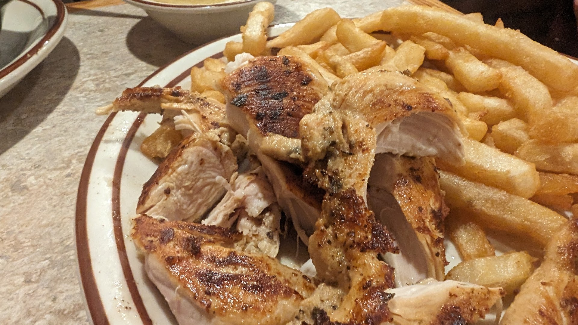 Read moreThis place describes itself as Winston-Salem's best-kept secret. But, like lying to your boss or telling your partner that the outfit looks terrible on them, some secrets are better left unsaid. This was one of the most pathetic, unorganized, and Bland restaurants I've ever been to. Somehow, the servers managed to mess up three separate meals. Then, when they did get it right, the waiter blamed the kitchen rather than taking any accountability; before we left, when we brought it up to the manager,r he additionally took no responsibility and blamed the waiter. It is clear that under the new management and based on some of the reviews, this place has gone way downhill. There is no passion in this place; there is no commitment to being better; we paid $60 for cold food, the wrong order, and downright disgusting. As the manager heard our grievances, he did nothing to make up for it, not a discount, not an apology, nothing. The good thing is it's evident that the problem with this place is its management; there's a lot of potential as there is at least a theme to this restaurant. However, the theme is not good food, reasonable prices, or a desire to improve. Save your money and go across the street to Panera Bread. As you can see, one of the dishes looks like vomit-covered dog food. The chips were about as hard as they could be, the cornbread was as dry as the chips, and the chicken came out way too hot for our 5-year-old. The mozzarella sticks were $8. There were also no straps on the high chair, and the waiter didn't come to fill our drink...
