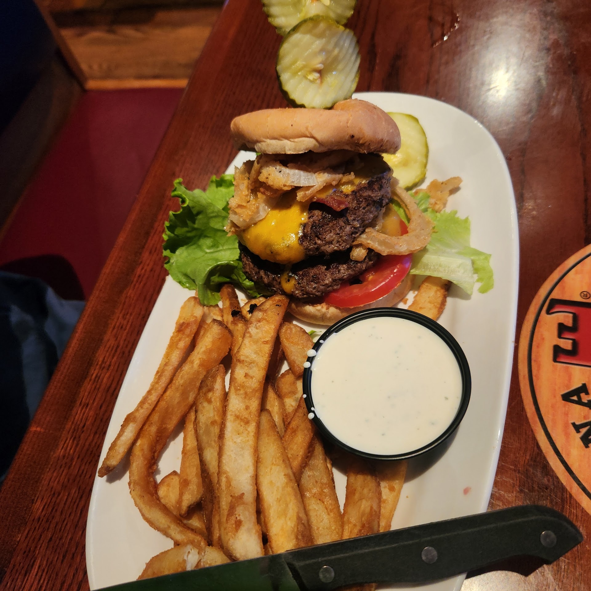 Read moreThere weren't many options at 1130pm to eat after our family member was admitted to the ICU at Forsyth Hospital. We were starving and SO thankful there were options besides fast food! It was surprisingly busy to be so late, so our waitress was overwhelmed but still friendly. We didn't mind....We were just thankful for fresh food and strong drinks! We got two burgers, The Pub Burger and The Double Wester Smash Burger, both with fries and a side of ranch. For me, a great burger is one that the patty is so good it can be eaten by itself, the toppings are piled high and unique, the cheese must be gooey and layed on thick! These burgers checked all the boxes and more! The pickles were even amazing, like how do you perfect a dang pickle? Well, they DID! The whole burger was so big, I had to squish it flat and cut it into quarters! We could've easily shared one meal and gotten full. The fries are fresh, melt in your mouth, yet somehow crispy and flaky. When you dipped them in the homemade ranch...chefs kiss I about hollered out loud..no joke! Every bite of the meal was followed by an exclamation of why this was the best burger we have ever had. Why is everyone sleeping on their burgers? Why has no one told me about this? It's got to be the best kept secret in Winston-Salem! Now onto the craft mixed drinks. Youve heart of Craft Kitchens but what about Craft Cocktails? They have them too! Their drinks don't have pre made mixers, everything is hand crafted with fresh ingredients and in house made mixers. I ordered a Blueberry Lemonade mixed drink and my Hubs had the Strawberry Basil. My drink tasted like summer in a glass, the fresh blueberries floating in the drink were delicious treats, the drink was strong and good to the last sip! The Strawberry Basil is the most unique combo. It's fresh, sweet and had some fizz to it. I loved the basil notes and again the fresh strawberries were yummy to munch on when I could fish one out! Now this would be a fun date spot, family dinner( Tuesdays kids eat for .99), or even having drinks with the boys. It's not a fancy place you'd have a romantic quiet meal, but the food is just as good as those places! We will be back Carolina Ale House, thank you for making our rough night better with a warm meal, fresh drinks and...