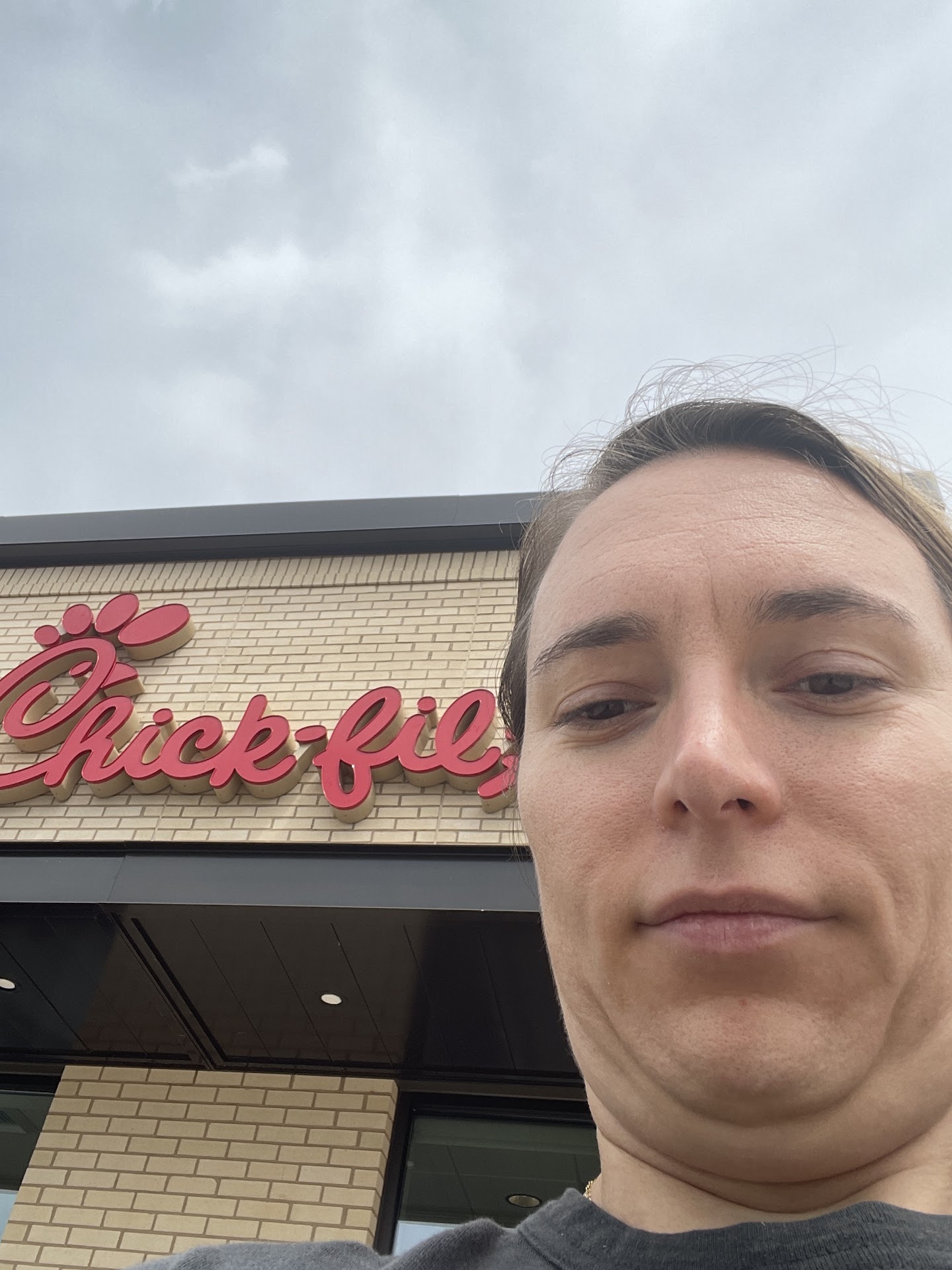 My sweet husband and I stopped at this chik fil a on the way to a wedding in VA. We decided to stop at the chik fil a here cause itâs just right off the interstate. So what had happened was we got inside and ordered our food. For me it was a #1 delux with pepper jack cheese and unsweet tea. For him it was a #6 with coke no ice. While I waited for the order to be ready (we got it togo), he went to the bathroom. I want you to know that when my sweet husband came out of that bathroom, he informed me that the toilet was out of toilet paper!!âŠ.I mean good grief. So we get in the car and we go next door to the gas station. As my husband pumped gas, I pulled out the box containing my chicken sandwich. I took a bite and thought âshoot! This pepperjack cheese is spicier than usualâ. Finally about halfway through the sandwich I lifted the bun to inspect the patty and discovered they had given me a spicy delux!! Well so we decide to go back over to the chik fil a and when I made them aware of the grievance, they gave me a new #1 delux with pepper jack no questions asked. The bathrooms really upset me though so I donât think...