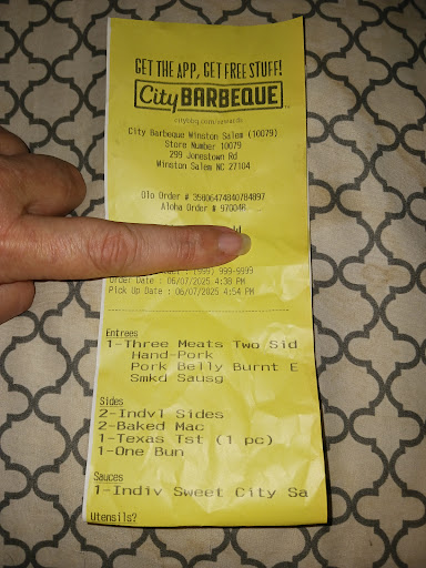 Read more07/23/2025 I ordered deliver from City Barbeque. I'm unsure but since I live around the corner from here, I assume it came from the Jonestown Road, location in Winston Salem, NC. This is my second time ordering. The first time I ordered ribs on the bone, baked beans and potato salad and it was decent. The second time 7/23/25, I ordered the pull barbecue, collards, mac n cheese and potato salad and it was delivered around thirty minutes or less. I would suggest never ordering the pulled barbecue. It was very dry, and tasteless until you added the barbecue sauce. The collards tasted like they added sugar, vinegar and heavy handed on the salt. The mac n cheese tasted like a mouth full of old age cheese n lard with no good seasoned flavor. To me the only thing that tasted okay was the potato salad. I paid nearly $30 bucks for this including a tip for the delivery driver. I would like a refund and if you need a cook for the sides like collards, mac n cheese, potato salad, etc..... I can give you some tips. I am a southern cook from Georgia and we know how to season food. Sometimes less or no salt is best since the other seasoning have it in there already and meat should be cooked slowly in their own juices, preferably marinating over some hours, and never cooked frozen nor too fast so as to not come out dry and favorless. And please, please, no sugar in the greens, ugh..... Would I order again, I am all about second and third chances. If I did, I would only order the barbecue on the bone, potato salad and baked beans, say a pray and hope it is not too dry and salty. This is my honest opinion. I apologize, but I didn't take any pictures but I do have receipt of the purchase. In all fairness, I can't rate on the atmosphere because we...