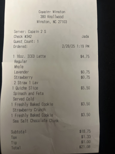 After a long and frustrating wait, I was finally able to try my food. The quiche was delicious, but the Sea Salt Chocolate Chunk Cookie was not warm enough—the chocolate chips had melted, but the cookie itself was crunchy and cold. Later in the day, I had the strawberry crunch cookie, which tasted completely different from the first time I had it. It was dense, dry, and, as a baker myself, I could tell it had...