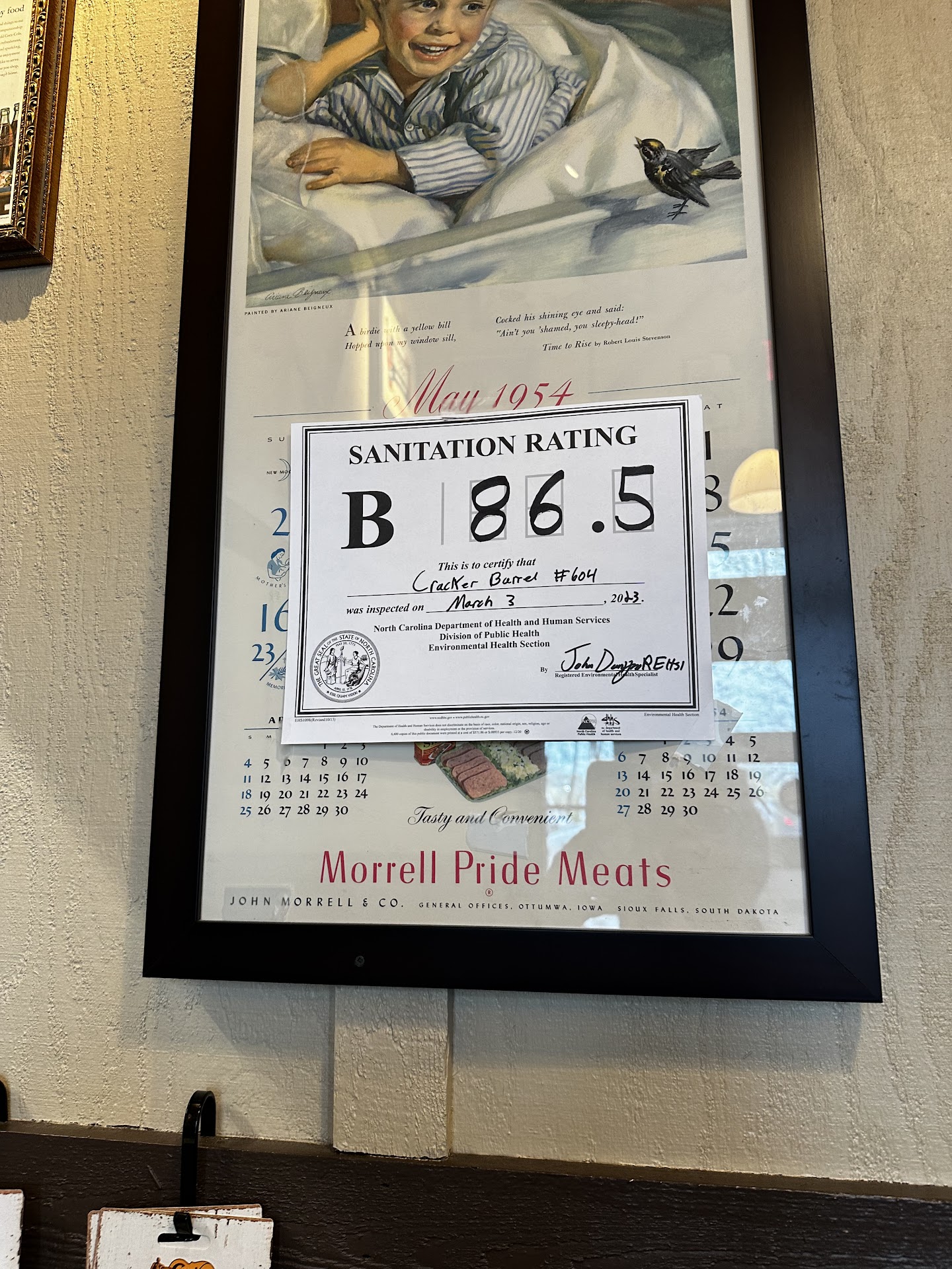 To beat all, I went inside to see what was going on, and couldn't help but notice the sanitation rating of 86.5 dated 03MAR2023MON....