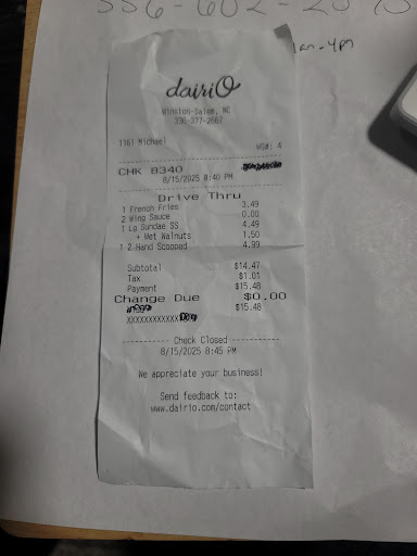 Read moreTypically I have had an overall good experience with this Dairio but Meredith changed that today. I came through the drive thru and ordered a large hot fudge sundae no cherry add wet walnuts and 2 single scoops of chocolate ice cream in separate cups and a large fry. I repeat my order several times to make sure the lady at the window understood exactly what I wanted. I paid the 15 dollars and change and when I got my order I recieved the large sundae, the large fry and a cup with 2 scoops of ice cream instead. When I brought this to the attention of the staff that I specifically asked for 2 single scoops of chocolate ice cream in 2 separate cups I assumed they would just correct their mistake. Instead I was told that it was against there policy to fix the mistake and if they did they would have to cancel the order and rering it resulting in an additional charge. The other option would be for them to give me an additional cup and I could fix the issue myself by seperating the scoops. I asked if they could just seperate the scoops being that is what i ordered and it was a flat no due to company policy as explained by Meredith. It is hard for me to imagine that Dario would have a policy in place that prevents staff from correcting a mistake they made and instead having the customer just deal with it. Beware if your order something here. If you order a large fry and they hand you a small one they will not be...