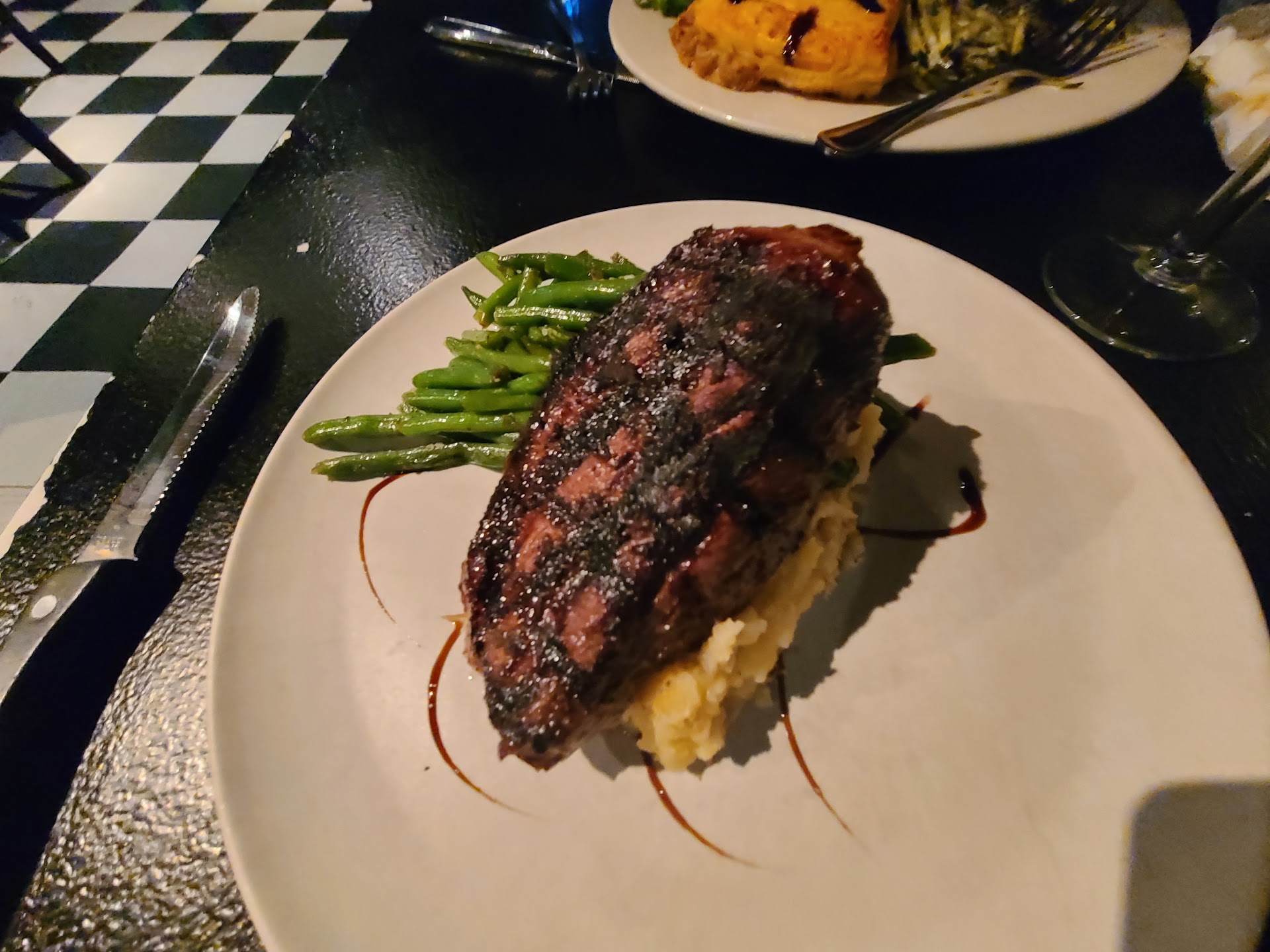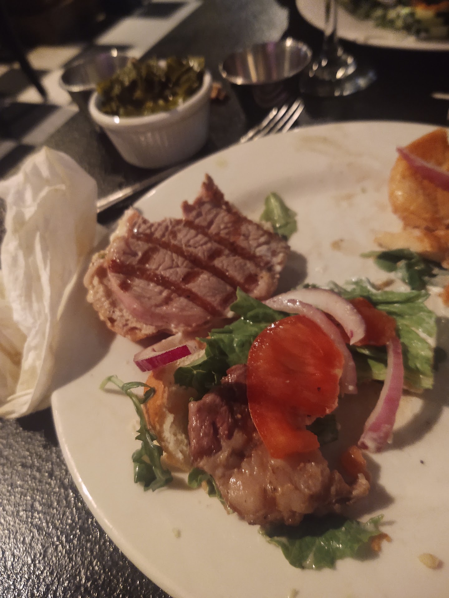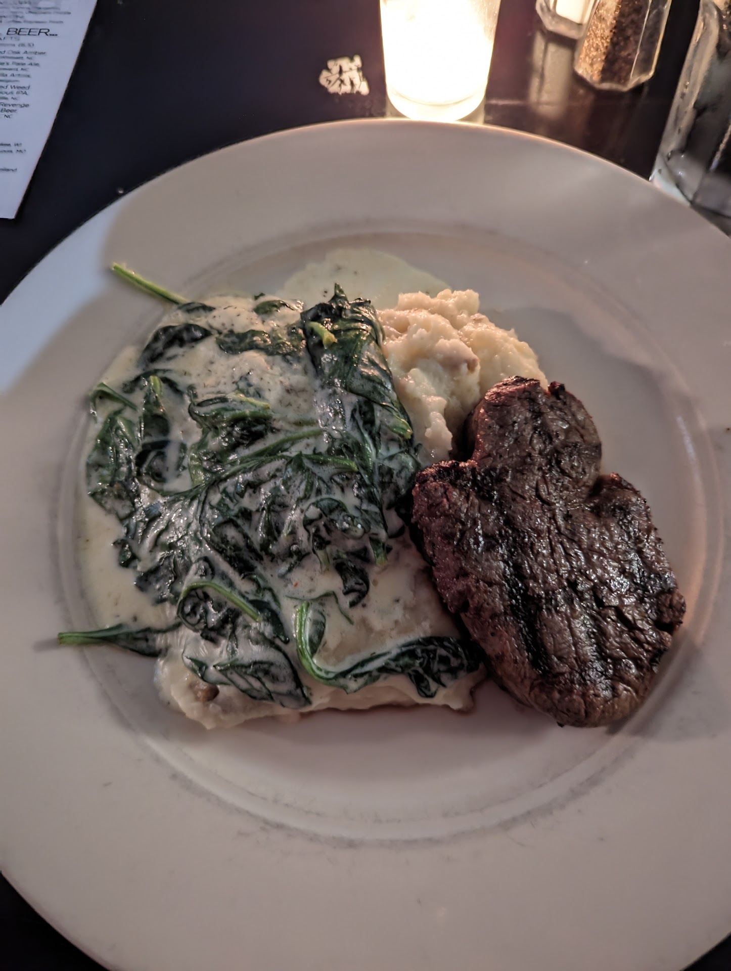 Read moreI would start off by saying this restaurant has a very nice atmosphere very cozy but very dark as well, for those 40 and over you should bring a flashlight and some glasses so that you can see the menu. Ideally the menu fonts need to be larger and more readable especially since it's dark in the restaurant. The service was definitely lacking and there wasn't much attention paid to making sure our water glasses are filled considering that was what we were drinking. We did have a half-filled overpriced glass of wine. My friend had the salmon salad which she enjoyed. I had the ribeye sandwich served with a dry hoagie roll and some arugula thrown over the top of it, very pretentious and not very tasty. I practically had to beg them to bring me some mayonnaise. On top of that they charged me $3 extra for some lettuce and tomato to actually make it some kind of sandwich!