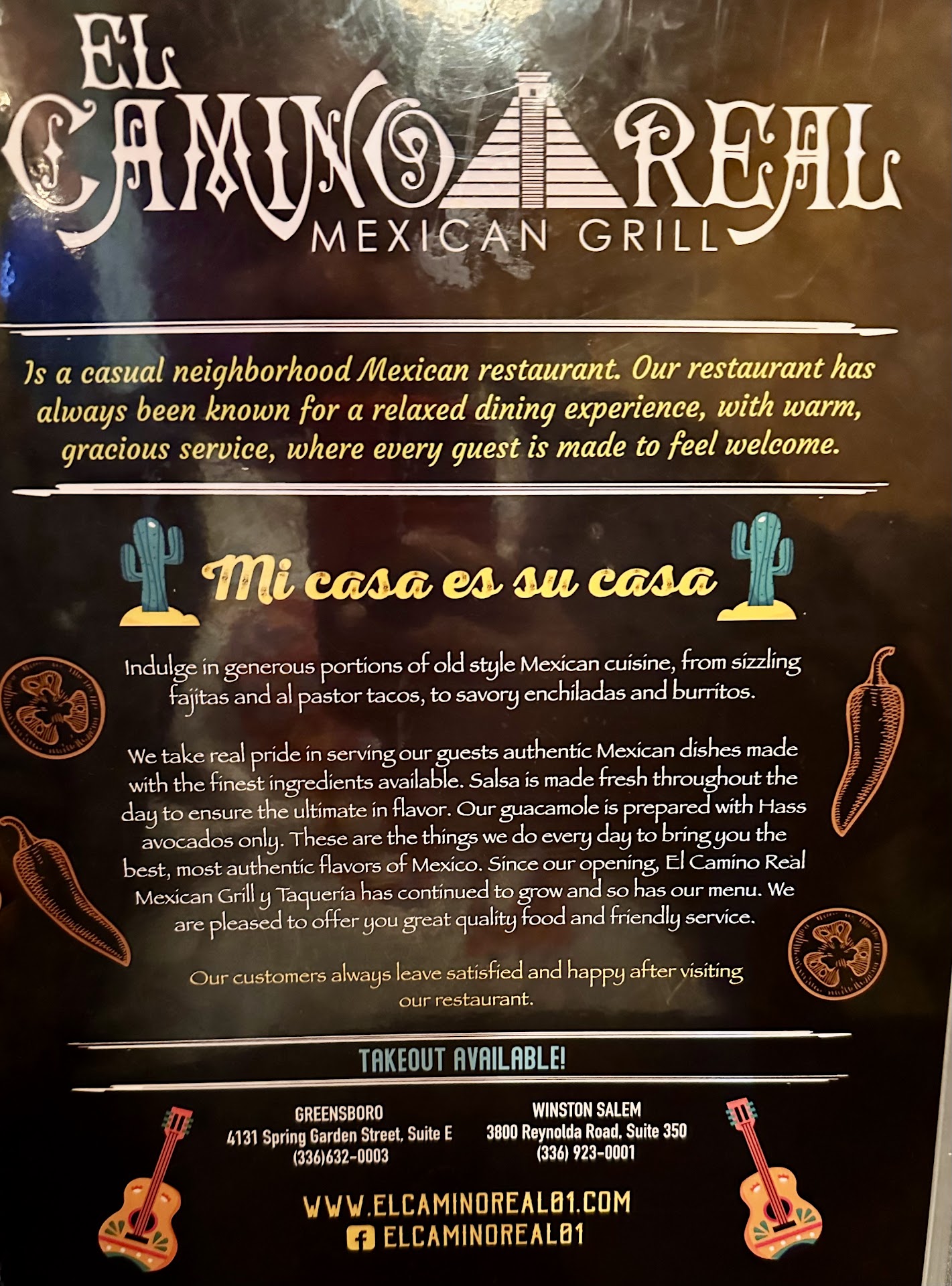 Located in a shopping strip just off the road. Large ample parking lot, some outdoor seating. Very inviting as soon as you walk in, festive environment with music in the background. Staff greets and seats you immediately at one of the many tables or booths. There is also limited seating at the bar, which has a great selection of beers and mixed drink’s. Menu has lots of your regular items found at other Mexican restaurants but here they also have some more traditional dishes, always check out their specials also as they are usually pretty great. The free chips are fresh and light with some good sauce, hotter version available upon requests. Their Choriqueso dip is creamy with small pieces of chorizo in every scoop. Their tacos come in 4’s and can be combined 2 and 2. The Al Pastor are the ones who the most flavors, with onions and grilled pineapple in every bite, comes with a red and green sauce…..I lean green! My wife got the Mojarra Frita, a whole fried fish which is crispy on outside and tender inside. ACP is OK as per my daughter. Overall it is a nice family friendly restaurant where owners and staff value...