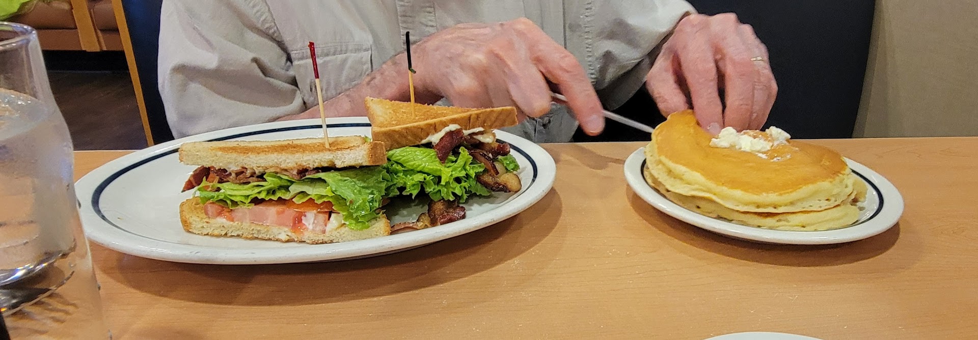 Read moreThe place including bathrooms were very clean which I really appreciated. The staff was nice. Blueberry pancakes were amazing. I would order them again in a heart beat. I ordered eggs scrambled extra well done. Typically when I say this I'll get a little bit of brown on the eggs-which is the way I was wanting them. My eggs were barely done at all and were so greasy with what I'm assuming was butter. I couldn't really eat them :(. I've been a million places and ordered eggs the same way and I've never had eggs so greasy there was butter running along the outside of the plate. Definitely was not good. It was about 1.5 hours before they closed and you could tell they made more sweet tea because it was warm (which is fine because that's how you brew tea) but it had MAYBE less than quarter of the sugar in it that sweet tea should have. And with only 4 soda selections, I'm sure they go through a lot of tea. No Dr Pepper or Mr Pibb :(. Overall I would go back because the blueberry pancakes were delicious. I will just...