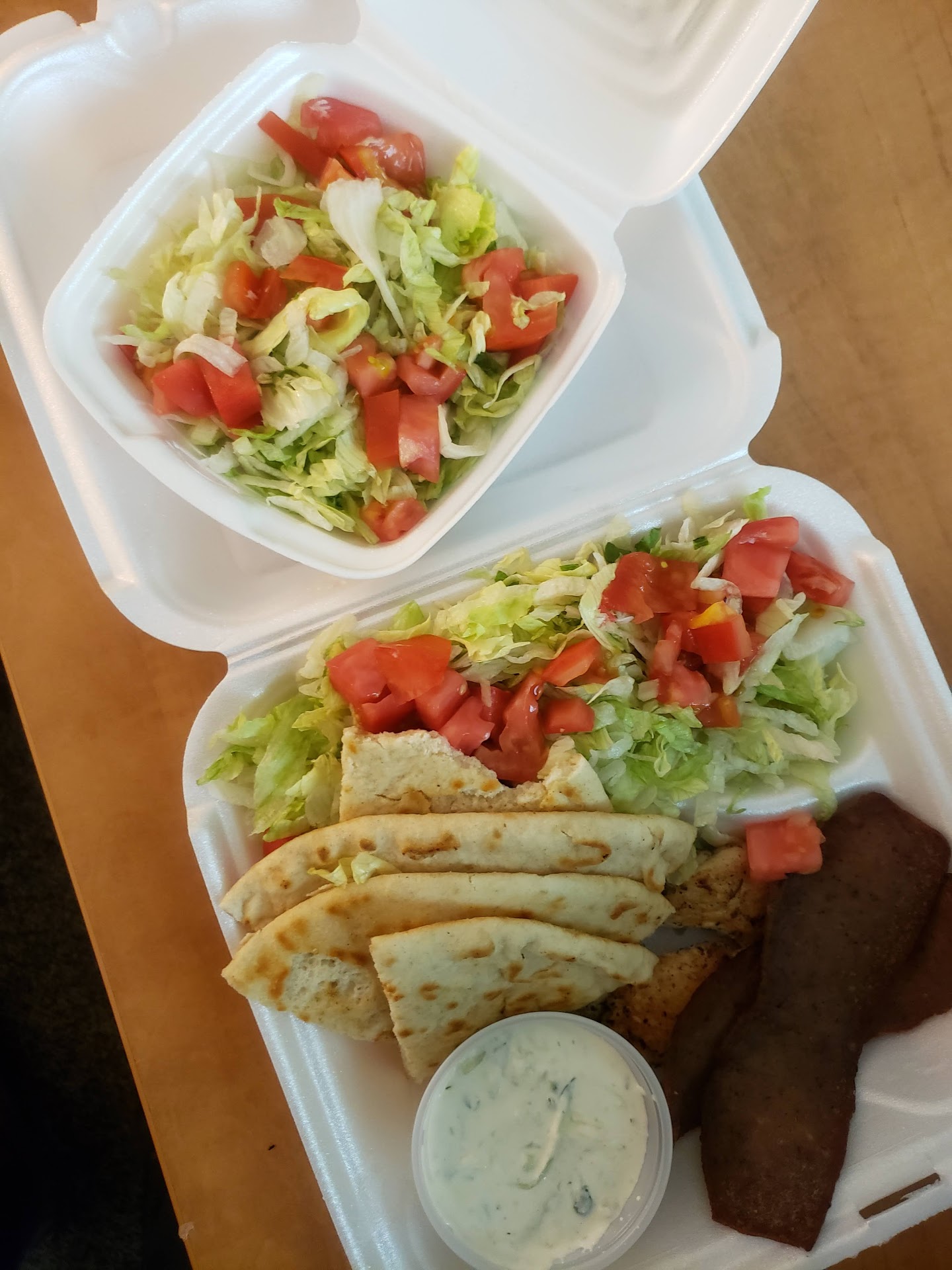 They seasoned the chicken so well, but the Gyro meat was on the thin side but still tasty. The salad was just a salad to me. Not greek without feta cheese. The tzatziki sauce was good, not too runny or too thick. The pita bread was nice and warm. Overall this would have been a bomb plate if I had feta cheese on my salad!