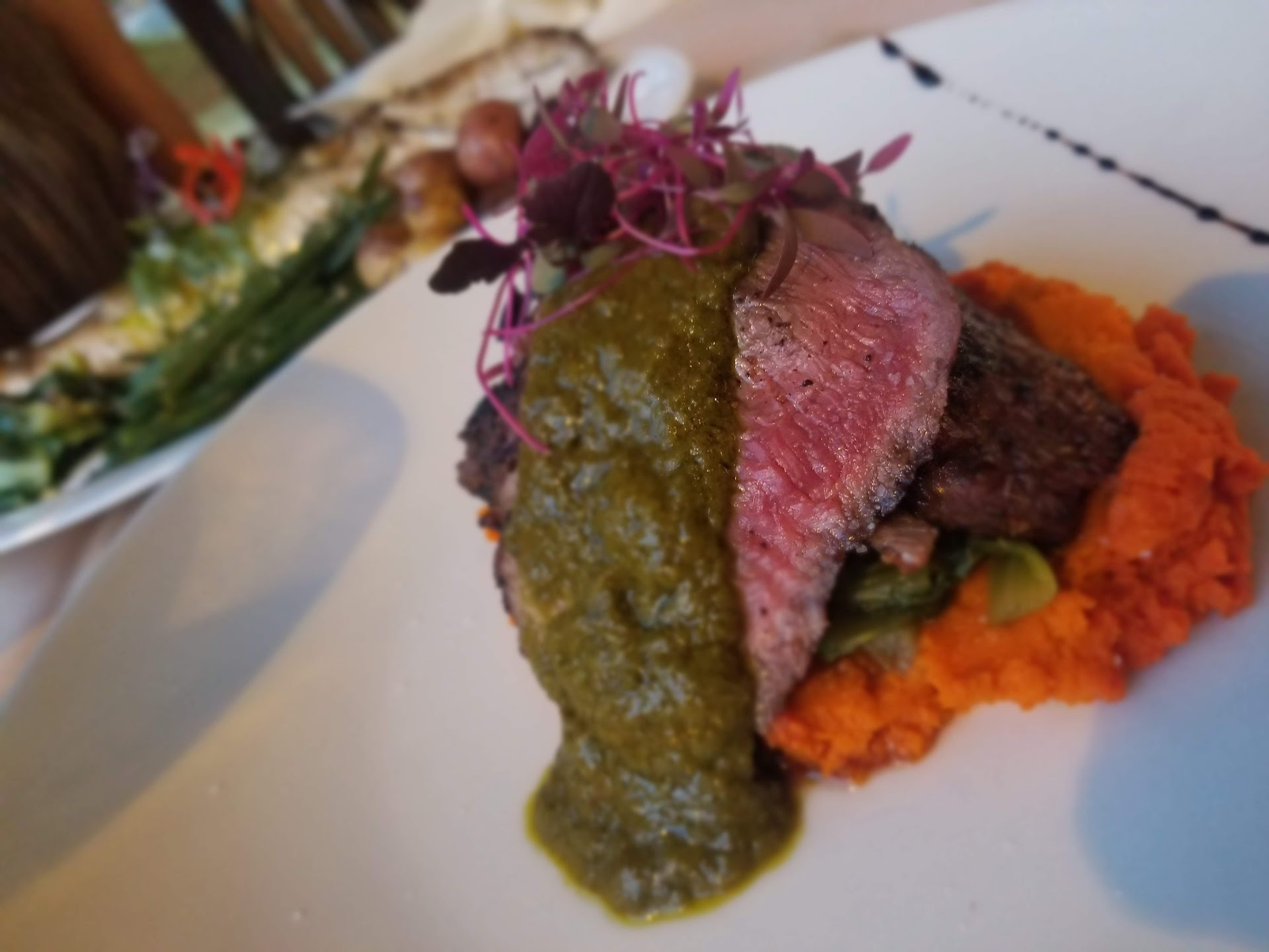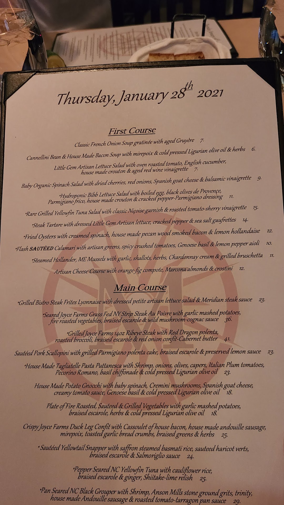 In a word... underwhelming. When we see a fine dining restaurant with prices like Meridian, the bar of expectations are high. Including 20% gratuity, we spent $52/person. DRINKS: My parents and wife all got tap water... and evidently after you order your meal, you're not allowed anymore. Refills were never offered again. I got the spring water, and had to give myself a refill most of the time from the bottle. There were a couple of waiters serving about four or five tables, so I'm not sure how service could have been much easier. My dad and I got some beers, both of us asking questions about the craft beer list, but the waiter couldn't tell us and didn't offer any draft samples, so we made educated guesses. But, we were never offered more beer once we finished the first round early on. Eventually I ordered a Diet Dr Pepper (which the waiter didn't know they didn't have). A couple minutes later he showed back up to tell me the bad news. So I opted for a regular Dr Pepper (which he didn't know they didn't have, even after the first trip). A couple minutes later he recommended a Diet Coke. So I complied. This was during the meal, and once again like the waters, either the waiter didn't give a dang or refills aren't allowed. I went thirsty the last half hour. FOOD: Mom's snapper was the best plate on the table and was honestly really good. Dad got the yellowfin tuna, and it fell short. The man loves tuna and loves food, and this is the first time in my life I've seen him push his plate away about halfway through. I asked him, and he politely said, "It was ok." That means it sucked. My wife got the antelope, and admittedly it was our first time trying that meat. She asked the waiter if he would recommend it, and he informed us he'd never tried it. What? TGIFridays makes their wait staff sample every dish. How is it the Meridian has wait staff that doesn't know what the dishes taste like? In short, the third most expensive plate on the menu had good taste and was chewy. She even had me try to cut it with a steak knife, which proved somewhat difficult, rubbery. I opted for the Duck 3-Ways, which was actually 2 ways. I ordered it rare, but it came out well done. So I spent 10 minutes trying to flag down my waiter to request a redo. He finally came over, and I showed him the error. He repeated back to me, apologizing that it was undercooked. I corrected him. No, it was overcooked (as he can see and remember from my rare order). I suggested I try a different dish, since the duck was botched. The waiter insisted I try the duck again, twice. So I eventually complied. So he took my plate, had the kitchen cooked it again, and got it medium rare. I'll take it. The second time, it was actually pretty good. The down side was I got to eat my $37 bird alone, since my family had already stopped eating. No discount for the blunder was offered. Beware Winston-Salem. Happy 45th Anniversary to my parents. It was our first and last time...