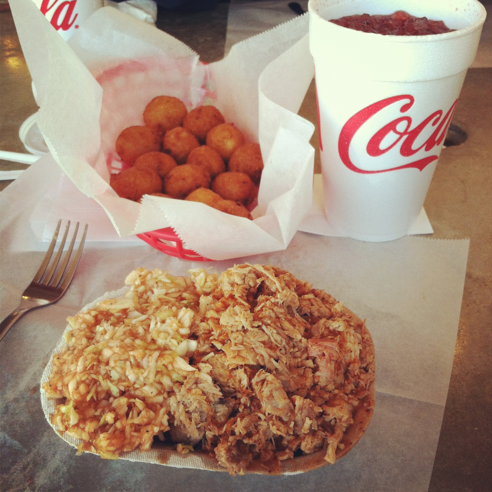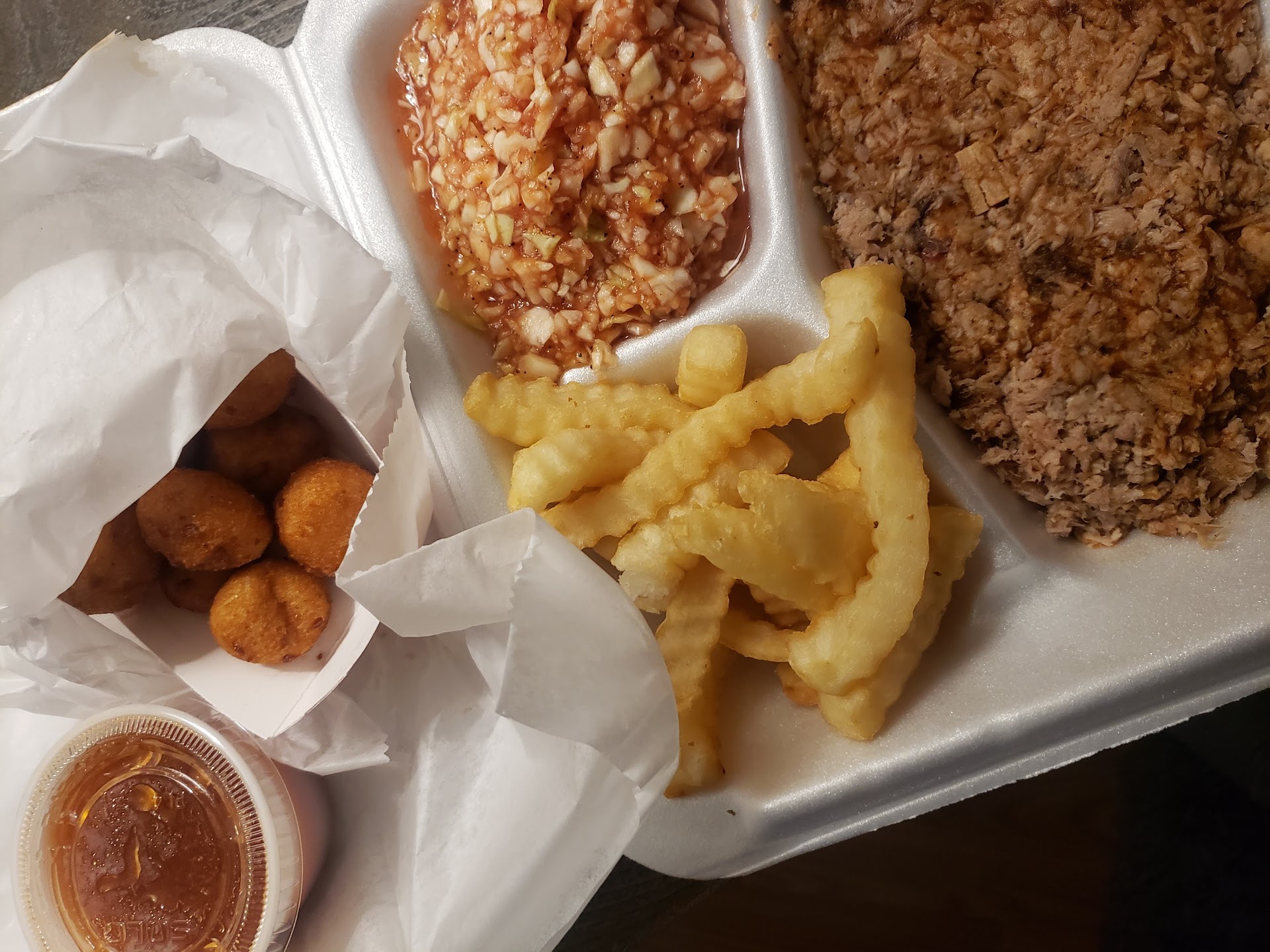 I gave this place 1 star cause it has 1 thing going for it... The food itself is not bad. We has chopped bbq plate, Cole slaw, bbq slaw and tater tots. I didn't call my mom but didn't complain. A few things upset me, 1. No kids menu, not the end of the world but we had to order a la carte for the girls. 2. Few recommendations, didn't get much help from the wait staff on picking or suggestions though we were first timers. 3. They really screwed us on the back end in paying. I had a BBQ plate 7.99 plus .99 to "upgrade" to tater tots from fries. My wife ordered a BBQ tray for 6.49 and tots not realizing that a side other than slaw didn't come with the tray and we got hit with 3.79 for a side of tots. Ordered a hot dog for 2.49 for the girls thinking it would be good from a BBQ place. They looked like they were boiled or heated up in the microwave, not even grilled. We also ordered chocolate milk for them cause we promised earlier they could have some, so the staff brings a 20 oz cup 1/4 full cause they're small kids and we go to check out and its 1.79 per kid for milk. Plus another 3.79 for their side of premium tater tots. So bill for 4 adults 2 kids, trying to be cost conscientious 34.10 (we also had some $2 sweet tea) I argued with the checkout person and she was basically like ,yeah, I know, it's crazy. Also it's cash only which I knew walking in the door but with $25 in my pocket, thought we would be fine but had to pay another 2.50 to draw out 20 from the ATM conveniently located next to the register. Overall food 3 stars, I've had better, service 2 stars, ok but not great, atmosphere 1 star cigarette ads all over the place, not being little Richards smokehouse 1 star for misleading me in the first place, price, 1 star, looks good on the menu board, rips you off on the back end and no means to argue cause it's in your stomach already. I said to the manager on the way out, see you never again and she said ,ok, have a good...