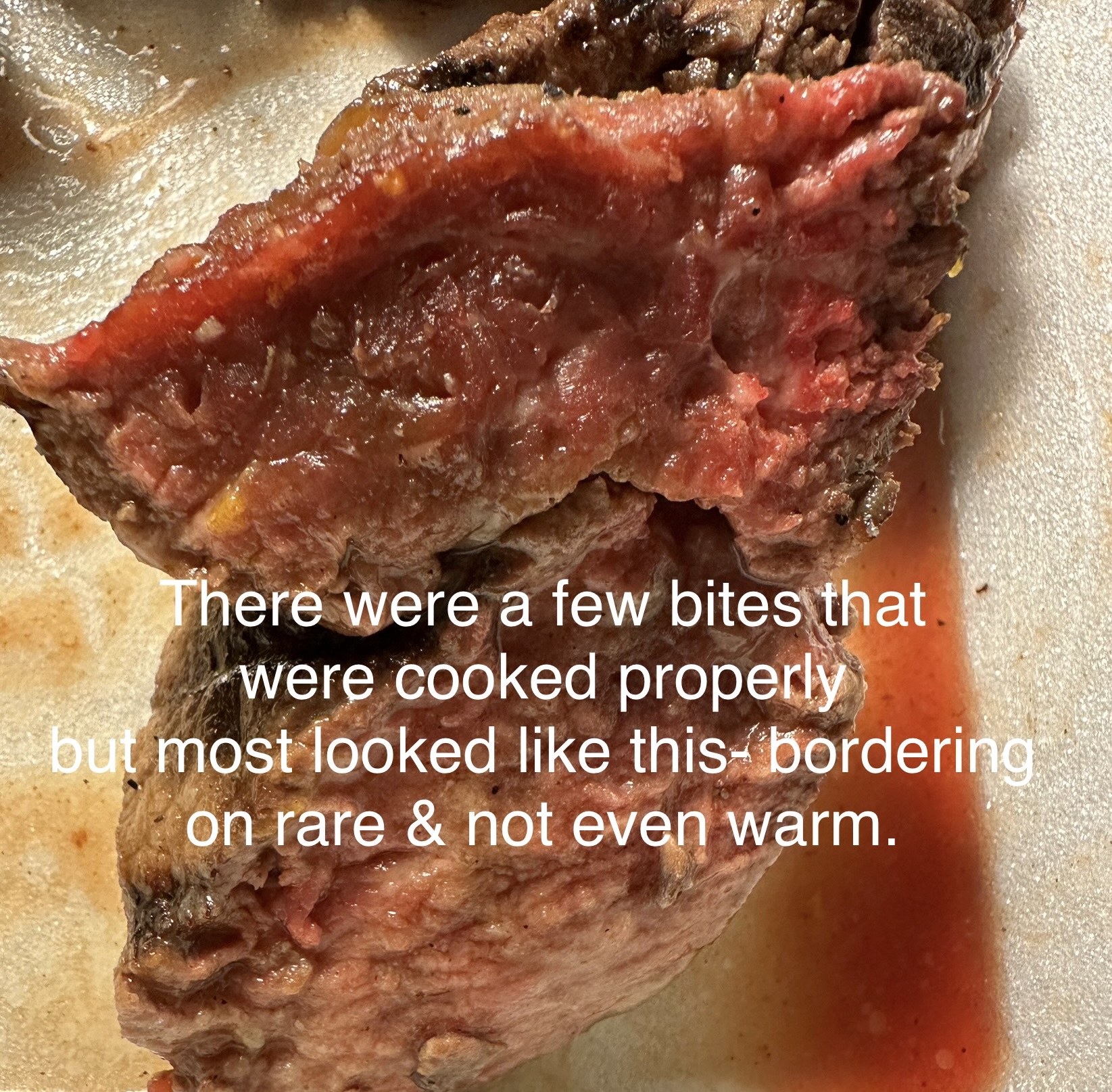 When our food arrived the server asked us to cut into our steaks to check them. None of them were cooked properly. After being there for 2 hours at that point I was hungry & decided that mine was good enough so the server took 2 back to the kitchen. Once I took the first bite I realized that it wasn’t even warm in the middle so I had to call her back over & request another steak. When they returned with our steaks only 1 of them was cooked as requested, the medium well one. My brother decided to send his back again. I don’t send food back a 2nd time so I just asked for a box to take it home in so I can throw it on the grill to finish cooking it later. My brother’s 3rd steak came out still not cooked to medium but he decided to go ahead and eat it. (We also saw a man sitting at the bar send his steak back twice while we waited at the bar.)