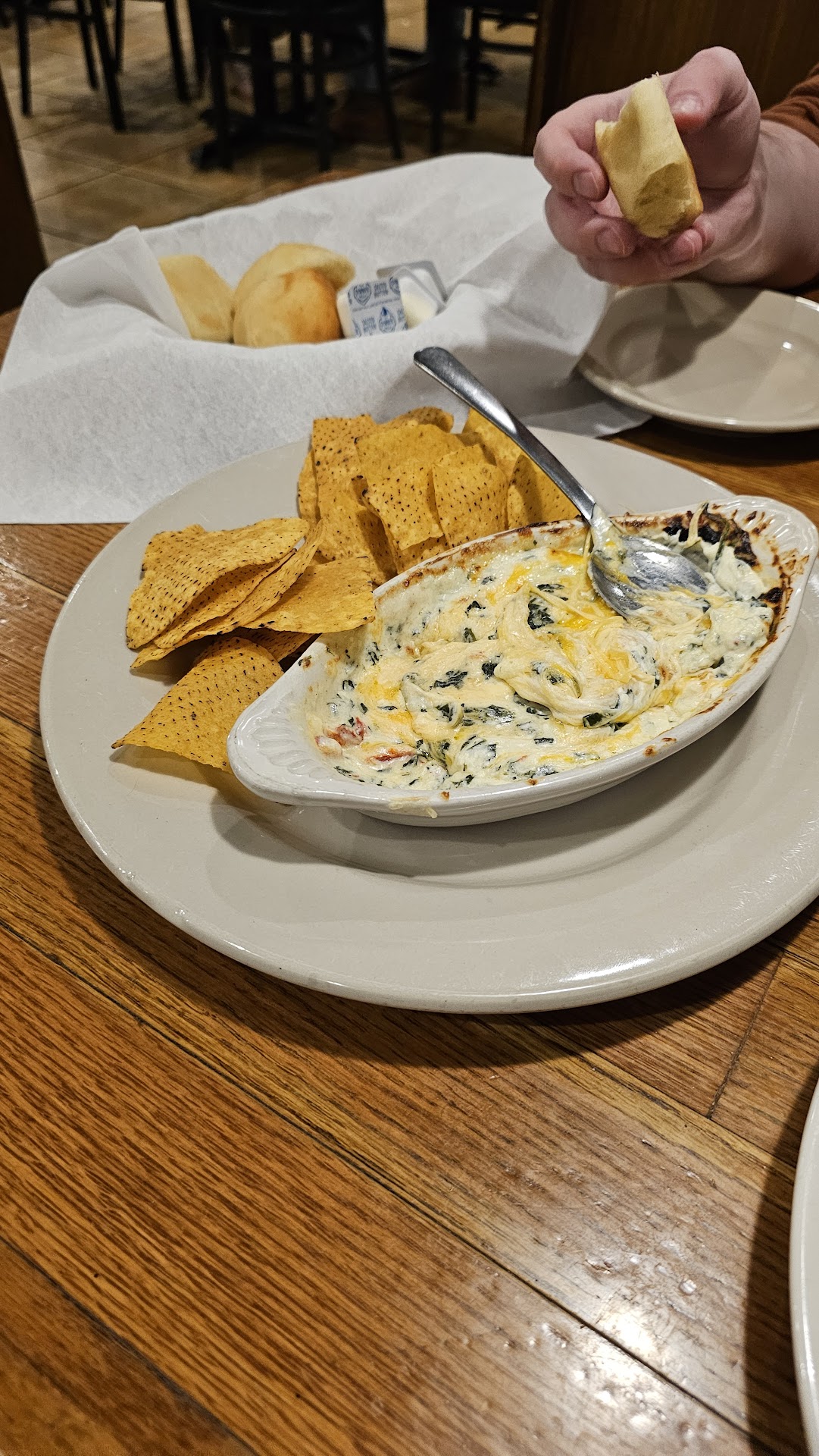 The food: Honestly, whoever the chef was is too good for that restaurant, and what I mean by that is the food was cooked well, but it was weird. I asked for a medium burger, and it was perfectly cooked. My partner ordered chicken, and it was perfectly cooked. The recipes were weird, though. My partner got the pecan chicken, and again, it was cooked perfectly, but it was a weird recipe. It was very sweet, and there wasn't anything savory to balance out the sweet. The Mac and cheese was fine, a little bland, but fine. The burger was also bland in flavor (like no salt, no pepper, no nothing), but again cooked perfectly. The brioche bun had a weird aftertaste, though. The fries were good if you dipped them in barbecue sauce, but they also had a weird aftertaste. We got the spinach dip, and that was truly disgusting, don't waste your money. The chips were definitely just from a bag and had a really bad flavor that overpowered the dip. But the dip wasn't anything great either, just all around bad dish. The best food I had was the bread I had to...