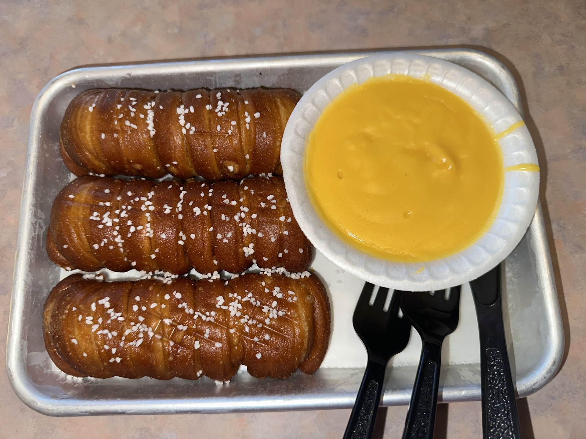 The pretzel sticks came at 4:49pm. They were hot, fresh, and delicious. The cheese on the other hand, was not very tasty.