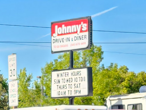 Johnny’s Drive Inn & Diner parking lot was hopping at noon Monday (late March) and the clientele arrived with license plates from three states other than Oregon. Johnny’s rose from the figurative ashes of a former A&W restaurant. The A&W signage is still visible on the drive in menu boards, which are covered with inexpensive paper menus (I posted a couple photos of the menu board). The glass-enclosed counter is covered with hand-written signs, listing shake flavors and daily specials.