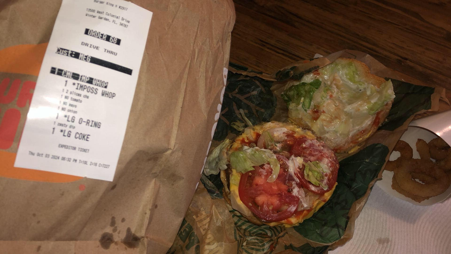 Read moreI was excited to try the brand new remodel of this BK location. I went during their first few days back and I was right away impressed by the new double lane drive through. Except I was quickly disappointed because this slows down the line immensely and they don’t even take the orders from each line as they should. Anyways, I ordered my meal with the side of onion ring and impossible whopper with cheese. Upon receiving my meal, I got fries instead of onion rings and no cheese on my burger. OK, mistakes happen no big deal. I returned again today and ordered the same thing. This time the lady in the drive though asked if I wanted zesty sauce with my onion rings to which i said yes! I also specifically asked for no tomato, mayo, or onion on the sandwich. Again, upon receiving my order I was at first satisfied to have finally gotten my onion rings, but to my disdain, did not have the zesty sauce. This confused me as she went out of her way to ask me if I wanted it, and then didn’t provide it. Again, I thought “OK, mistakes happen, the sauce is easy to forget” and I began to eat my meal. To my disappointment, the sandwich still had all the toppings I had asked to remove, but did add the cheese. Per the photo, you can see all the toppings I asked to remove, plus cheese, and zesty sauce are all on the ticket, but they didn’t read it? It’s like they only read the cheese part. Very disappointing and frustrating. I did not end up eating this sandwich. Waste of money. Very strange how the outside is sparkling and beautiful, but the staff...
