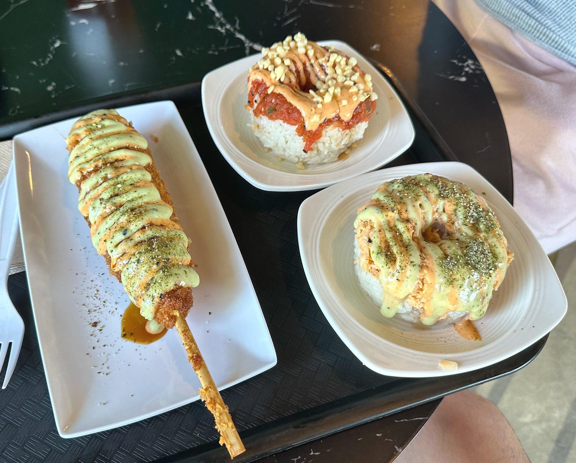 They advertise 6 different "sushi donut" options but apparently only offer TWO of them at this location, likewise the sushi pizza is not available here either, and those were the main draws I had for coming to check this place out... I find this pretty absurd, imagine going to a McDonald's and they say "oh sorry, the Big Mac is only available at some locations, and we don't serve McGriddles here either, check our website to figure out what is served where"... and this is trying to be a franchise?! You have got to be kidding me.