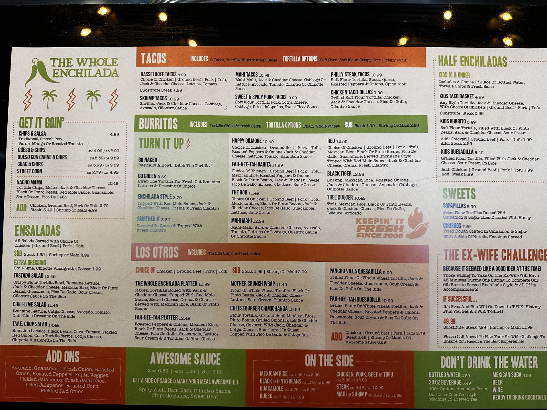 There was a group sitting across from us, inside the restaurant, with two dogs. I love and own dogs, but one of their dogs was sitting on the bench with them, with its head hovering over their food (over the tabletop), and the second dog was in a stroller with its chin resting on the table where food is served and eaten. The Whole Enchilada servers brought them their food and said nothing about the dogs being inside the restaurant, being on the furniture or being on the tabletop.