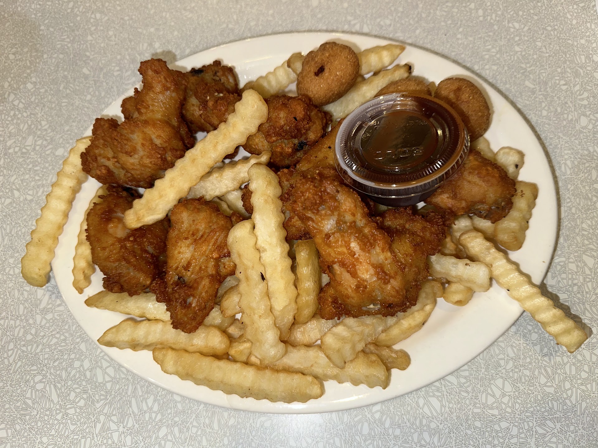 I ordered my food at 7:13pm. I got the chicken basket with double fries (vs coleslaw) and hushpuppies. I originally wanted a fish and shrimp combo but thatâs not one they already have.