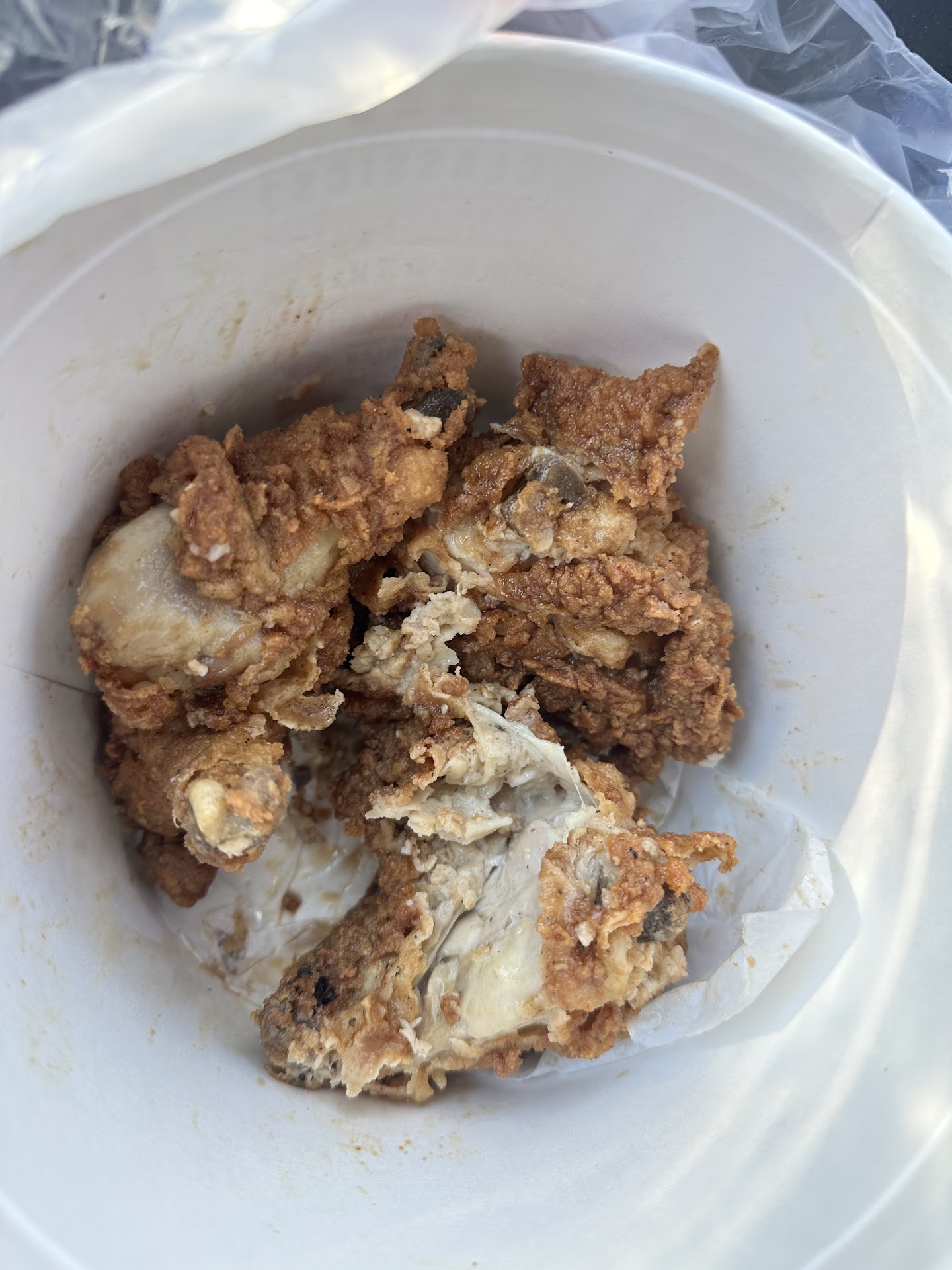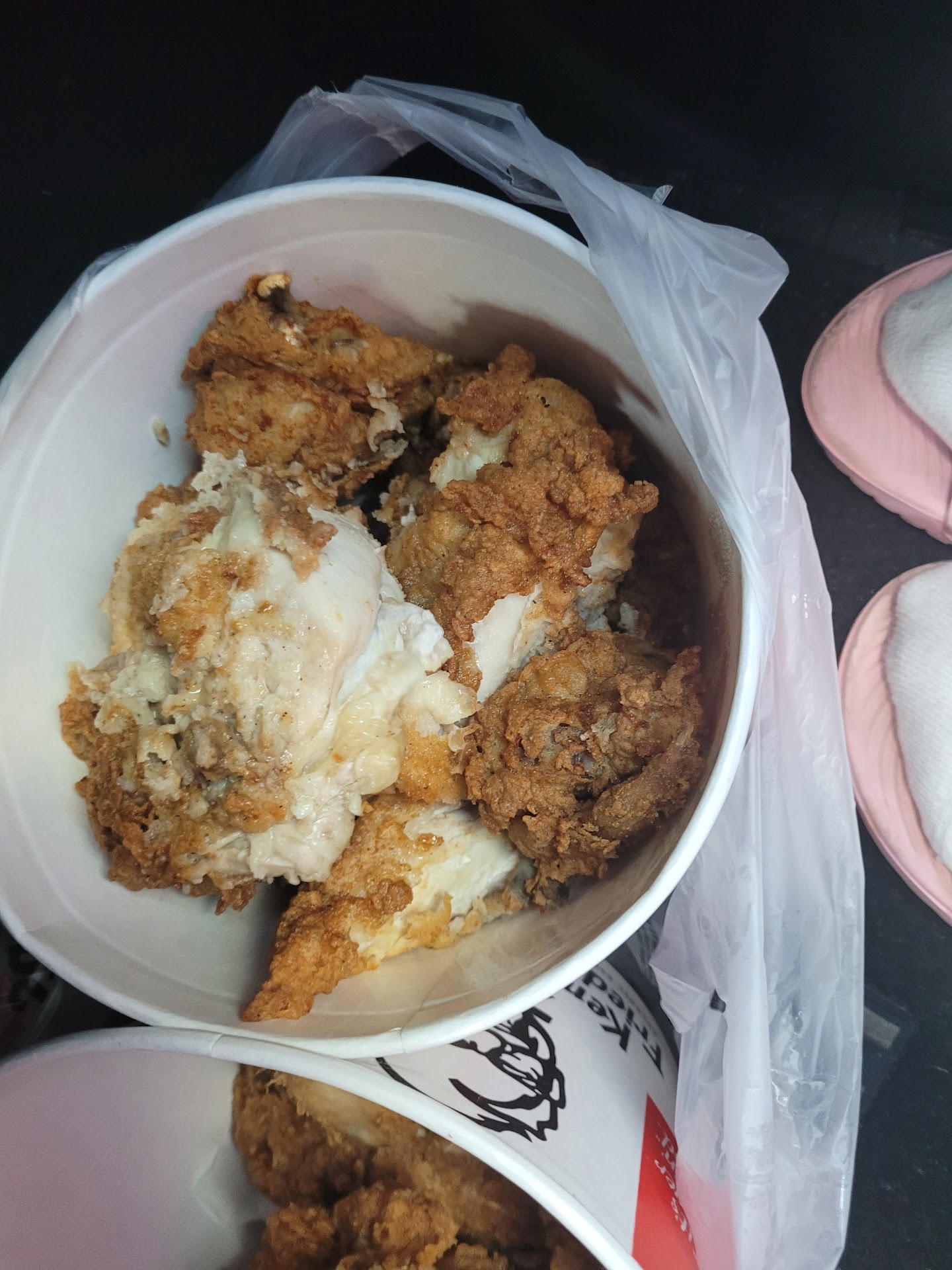 On 11/11/23 I placed an order to pick up at 7, I had a flat tire, so I called, told them that I was going to be about 20 minutes late, when I got there my food was on the counter, not warm but cold, I mentioned that to them, but the so call " "Manager" very rudely told me I was late picking up my order and that was that, I left, and when I got home, all the sauces, the utensils and plates were missing, and the funny thing is, on the bag, there was a slip saying, "Your meal was packed and double checked for accuracy" I called them back, talked to the so call "Manager" and she practically said that it was my fault for not checking in the bag, and that she was busy and hung up the phone on me. Then after reheating the food, the skin of the chicken was just falling out, looked awful, greasy and disgusting, the fries were soggy, so much grease, mashed potatoes, bad, even the coleslaw was horrible, everything ended up in the garbage, we knew that we would get sick if we even tasted that garbage. I called corporate and explained the situation, I told them I wanted a full refund, but the told me they could only refund half of it, because I received the food, that ended up in the GARBAGE. I will NEVER EVER, go back to that nasty place, that so call "manager" and her disgusting attitude is a detriment for that store, I guess you need the other half of my money to pay the clowns running that place "to the ground". The Colonel must be turning on his grave....