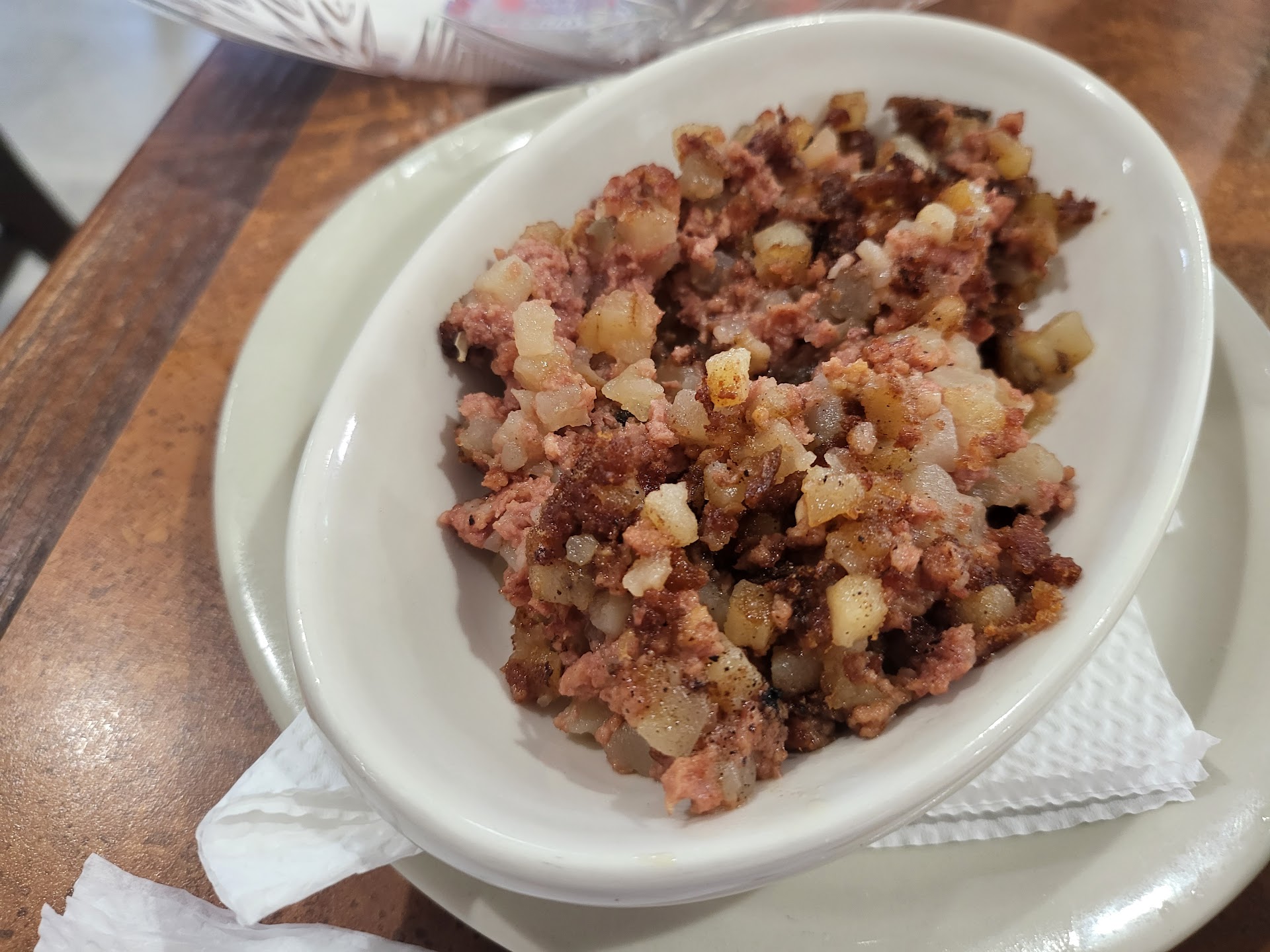 The food was ready in about 10 to 15 minutes and it was brought to the table. I call these layback pork chops because once you take a bite, you will close your eyes and lay back in your chair. You'll tingle all over and dream of your favorite memory. As you know, a perfectly cooked pork chop is an art. They have mastered the art. The first few bites were a blur. I started cutting the pork up in bites, but soon after that I had to grab it up with my hands. It was too good to wait for my hands to cut it up with a fork and knife. Then our experience hit another level. The cheesey grits were silky and peferctly cooked. Please note that they are not seasoned, so adding salt and pepper is not an insult. Salt and pepper are on the table, and a basket of utensils and napkins is brought to the table. Regarding the corned beef hash and srambled eggs, they were perfection. The corned beed hash was crispy, and the eggs were fluffy. I am a corned beef hash officiando, and it is top-notch. To speak to the portion size, it is the right amount. You will leave feeling the right amount of full.