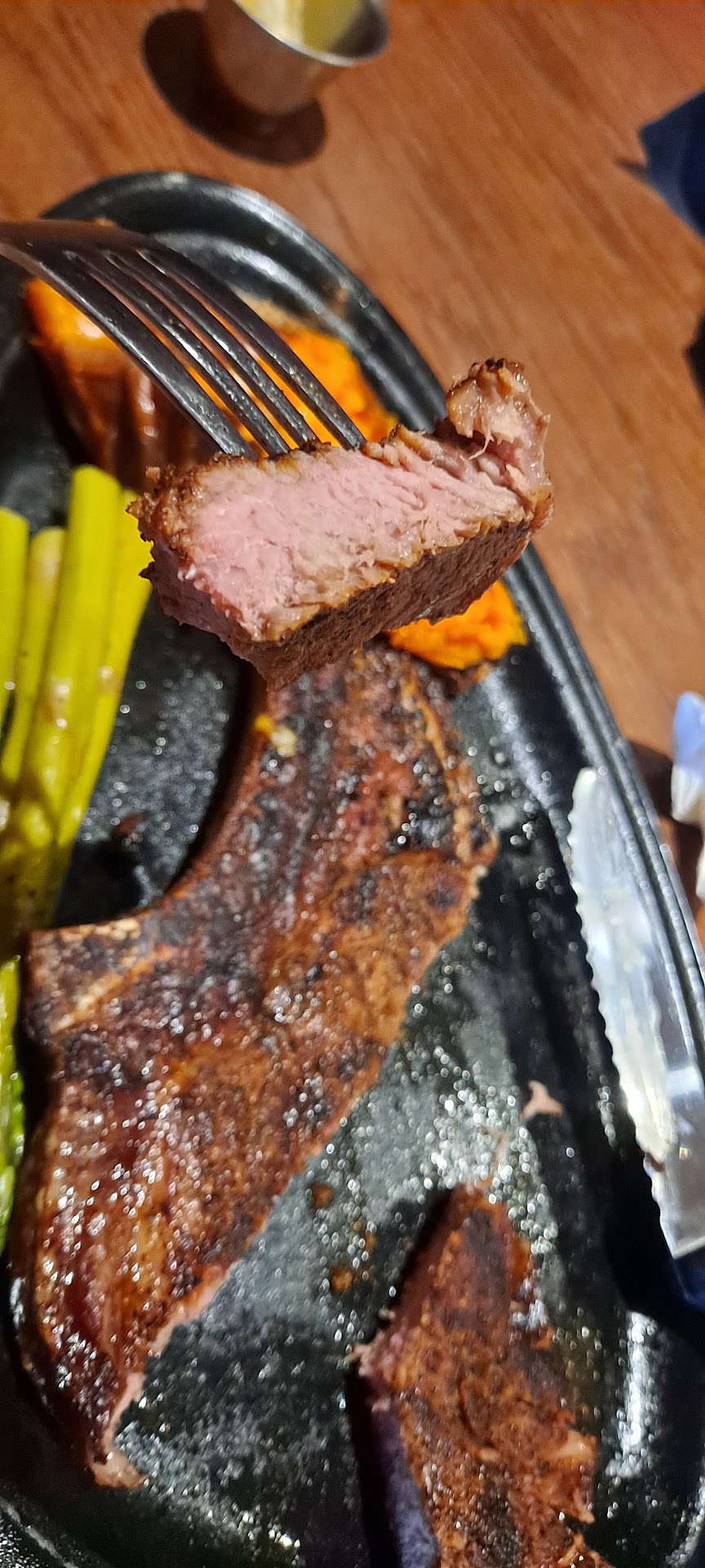 Went back last night with the family. Ordered the bone in ribeye and my older son ordered the ribeye, no bone. When the food arrived, my steak looked amazing. My sons steak looked like it had been boiled in water. Both ordered med rare. my sons steak was literally raw in parts. My steak was literally 1/3 fat, 1/3 tendon and 1/3 steak. As amazing as it looked, it tasted like it was cooked on burnt grease. We didn't complain and ate what we could. Surprisingly without asking or complaining, the young manager, said she was a co-owner came over and asked how the meal was. I advised her it was disappointing and showed her what the steak actually was, not looking to get a discount or free meal. She made the excuse the bone in was I believe she stated it was "wild cut." I'm 58 years old and I've had a lot of steaks. Her excuse for the poor quality was insulting to my intelligence. I've been here several times before and for the most part, the steaks are okay. Two weeks ago, it was spot on, last night, lesson learned. For a $30 steak, I expect most of it to be edible and not burnt tasting or raw.
