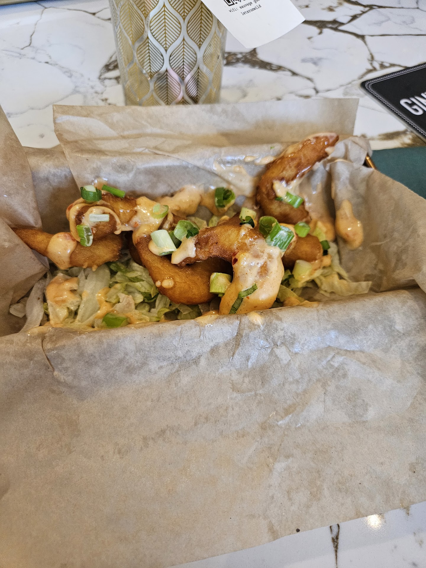 Read moreWhen we were trying to decide where our date night would be, we decided to try Sauvage. We've heard good things, and the menu and drinks caught our attention. When we arrived, we decided to sit at the bar. We were greeted quickly, and the bar staff was friendly. Ordered drinks first while we looked at the menu. The drinks took a while, but the bartender took responsibility for that and comped my drink. So service was looking good (for now). We looked over the menu on our phones (I'm old school and enjoy an actual menu to look at). We decided on the Pew Pew Shirmp for an app, shrimp tacos, and a burger. Food service took a while. We watched several other parties get their meals while we waited. After a bit longer, all plates arrived to include the app. We informed the young man that the shrimp was supposed to be an app. He informed us there was no such thing as an app there. Weird. They are labeled starters on the menu. Shrimp were fried in beer batter (emphasis on the beer!!). The batter had a very heavy beer flavor. My guess is an IPA, which i normally don't mind, but this was a bit too much for my taste. The shrimp were drizzled with a sauce that was anything but spicy. Nice flavor, but I expected more punch. The shrimp tacos were the same fried shrimp as the pew pew with the same sauce. Same over the top IPA flavor, which took the tacos several steps down. The burger was really good! Nice flavor and perfectly cooked! Fries were crispy but dry. I asked for ketchup but never got it, so I just ate them dry. My wife and I thought the tacos would be much better if the shrimp was grilled. We asked if that was a possibility and was told they would not modify the menu items. What you see is what you get. I'm not sure why grilling the shrimp would be an inconvenience, but ok. I think they would benefit from offering the shrimp grilled or fried as not everyone prefers or can eat fried foods. Especially with that over the top beer batter. All in all, Sauvage is just OK. Nothing to write home about. Drinks are good, but a bit overpriced. Food is meh. The place itself has a cool atmosphere. I would likely stop in for a drink here and there. Maybe we'll give the food another shot but will steer clear of the shrimp. Oh, and service started good but fizzled out after that first drink. We never saw the bartender again until it was time for the bill, and I didn't like the impersonal experience of just handing a piece of paper to someone with zero interaction. Note: This review would be 3 1/2 stars, but Google...