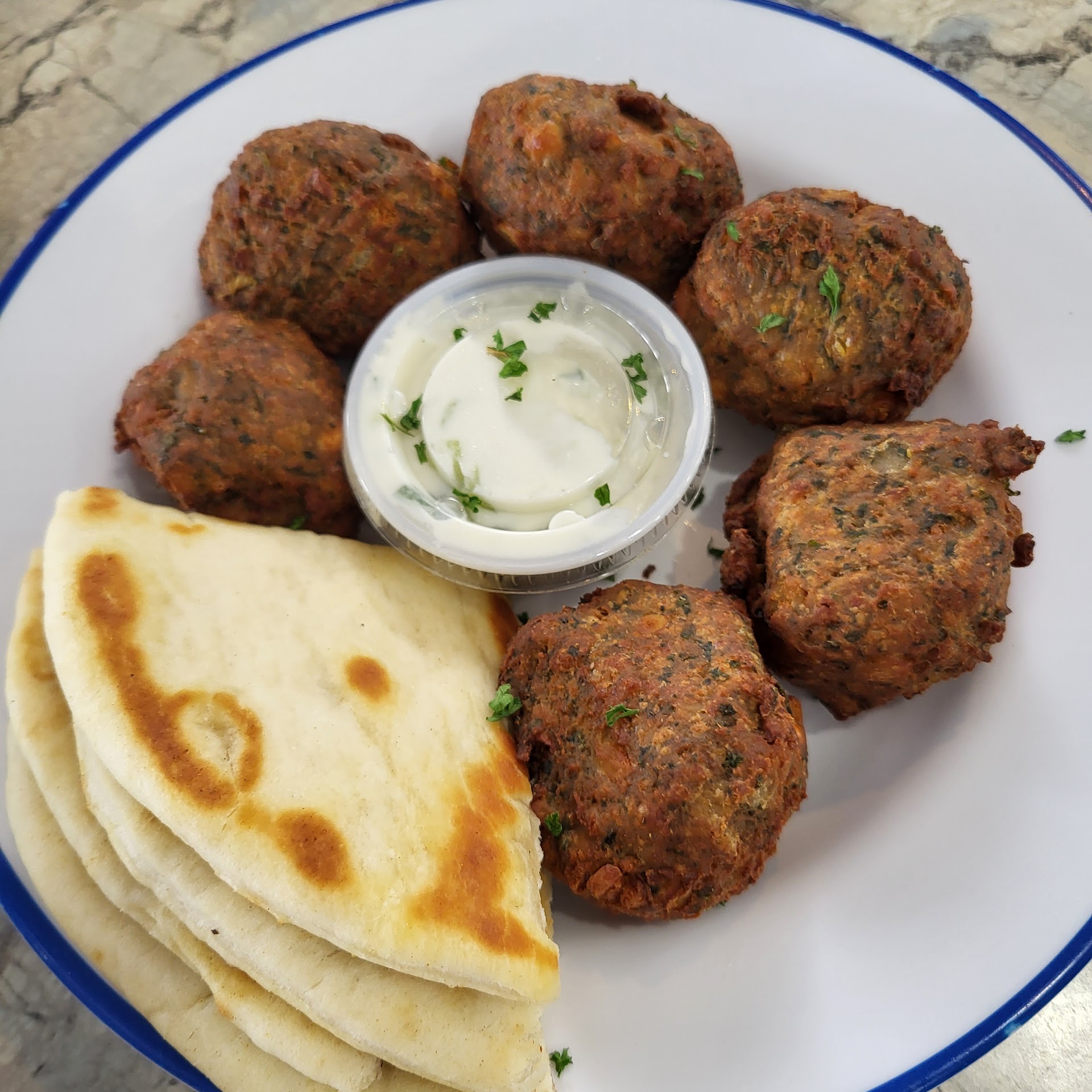 Walking in first thing I noticed was the sign with the specials on them. Some of it sounded delicious. The distance from the entrance to the ordering counter was appropriately spaced because the line gets long to order. One cashier and she has to take phone orders also. They take your order, you get a number, go sit down, they call your number, go get your food, and sit down. The sitting was nothing special nor any horrible, just basic quick dining not comfortable enough to sit back and chill and chat for a while. The area was nice sized, plus the was outside seating. They have a covered patio. The food was not impressive, period. It tasted basic. The falafel were gaint balls of bland chickpeas. My friend ordered so fried popcorn shrimp with stuff drizzled all over it and bananapeppers. To me, it looked like something a young person living at home created at because they had the munchies. I asked my friend why she ordered it, she said it sounded good. She picked through it but ultimately left most of it there. Now my meal was the special, sounded delicious as it was described, it had all things I like so I got it. The rice it came with was ok, nothing impressive, almost no effort at all. But the dish didn't look the same yummy it sounded so I wasn't very keen on it in the first place now. I tried it anyway. The tzatziki sauce was a joke. It was edible at best, not something I would ever want to eat again. It was truly a waste of my daily caloric intake. Not a place for us. Some may enjoy it, we did not. Not a...