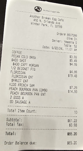 Read moreSigh. I read so many glowing reviews about Another Broken Egg Cafe and was dying to try it. After deliberating on which location to hit I decided to go with this one because it’s closest to home. Maybe that was my first mistake. After waiting a bit after being sat by a hostess a waitress came and took my order. I decided to get the crab eggs Benedict thinking I couldn’t go wrong with that. Wrong again. When the food came out after what seemed like forever, the so called crab cakes had a rancid smell like they had been left out all night and it just didn’t taste good at all. I know for a fact a good and fresh crab cake doesn’t smell or taste like that. The potatoes were stiff, cold, and dry. Nothing had any kind of flavor. So I alerted the waitress, decided to give it another chance, and tried the French toast colada, scrambled egg, and sausage. Although I was able to eat the French toast and it was okay tasting, the eggs were cold, and the pineapples were sour and not caramelized as stated in the menu. They tasted like canned pineapples you get from the store. The sausage patties were more like deformed hockey pucks (hard, barely lukewarm, and flavorless). I sent the eggs back and reported they were cold and they supposedly “remade” them but I noticed a dark yellow color on one section of the “remade” eggs indicating to me that they were old eggs. They don’t turn dark like that unless they’re old. Not sure what the deal is with this place as they have endless food quality issues. Basically nothing is brought out to you hot or fresh. I think they might be cutting corners to keep up with demand and cooking too much inventory ahead of time, which then sits and gets old and cold and they bring it out to customers. Maybe I am the crazy one here, but I don’t see how this place has such glowing reviews! To me, Kekes Cafe and First Watch both blow this place out of the water! I’ve even truthfully had better food at Perkins and that’s not saying too much. At least when I go to those establishments I know my food is hot and fresh! Unfortunately, I now believe that much more is “broken” than just the eggs at this place. What a letdown. I am genuinely disappointed. Oh well, back...
