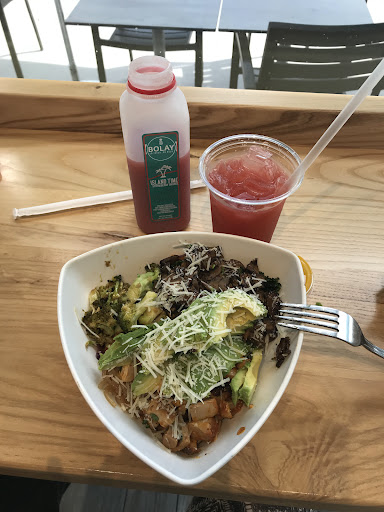 It actually breaks my heart to give only three stars to Bolay Kitchen. I started coming here when it opened locally, and was so thrilled because the only time I've ever tried it was in South Florida... And I Loved it! It was healthy, fresh, great options (Love the Sweet Potato Noodles!) and the entire restaurant is Gluten-free. However, I experienced several very disappointing issues on this visit. The amount of food was less than before, and when I was surprised by this, they offered to charge me more for "double base" to get more sweet potato noodles. I understand charging for more protein, and I always have to, because I love the shrimp. But even paying the up-charge, it was six shrimp... Not sure if you are paying for a large bowl with two proteins, plus extra for the shrimp, that I should also need to pay for a few extra noodles... Anyway, the food seems a little less fresh than usual today. The broccoli and mojo pork were tasty, but they were not warm. The sweet potato noodles are different, they must have a new sauce? They tasted okay, not as delicious as before, but they seemed too soft, they were Not the springy freshness that I've had previously. Which means they must have been sitting around for a very long time. The other extremely disappointing aspect, is the absolutely filthy interior. There were Both Flies And Gnats swarming all over the whole restaurant. I had decided to dine in because I needed to get caught up on a little computer work, and I was inundated with little black gnats and flies. Which of course got much worse if you got near the beverage station. Management REALLY need to get a handle on this issue, ASAP! Reading through all the reviews, it sounds like this has been an ongoing issue. Unfortunately (because I was able to watch for over an hour), at any given point there was only four to six tables of people inside the restaurant. But there were dirty tables the Entire Time. I watched one employee come out and wipe One table down and walk away, even though there were six or eight other tables that were dirty. Then a manager came out to sit down and talk with another employee, he took his mask down during the talk, and when done he asked her to clean up the area. She did a little around the trash bins to pick up the dirty dishes. But did Not clean any of the tables or the beverage area with the swarming bugs. And then another manager sat down for a few interviews, and he did not have a mask on his face, he pulled it down below his chin to do his interview the young man. BTW, That manager did not clean up the restaurant either. Cleanliness is Paramount in any restaurant, at any time, every time, always and forever. Period... However, in these current times of the COVID-19 Pandemic, wiping down the tables Every Time should be mandatory, much less with utilizing some type of disinfectant to be in compliance with the health codes! Good Grief, this is sad and Scary! How clean is the kitchen? if no one is ever cleaning anything out in the dining area? I'm afraid to know... Definitely worried about ever eating here again. The other issue that's been mentioned by previous reviews, the music is still Way Too LOUD. Outside it is eardrum blasting. Completely unnecessary. To the point that it almost made me turn away and not walk in the door in the first place. My only hope, that it wasn't as loud inside... It was loud, but not as bad as outside. Overall, the experience was very disappointing. I really hope they can get themselves together sometime soon. Otherwise they'll probably be closed for health code violations. Or maybe even noise...