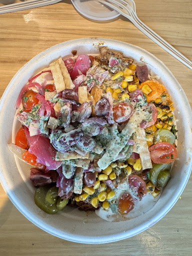 The best part is that toppings are unlimited and free of charge. You can pile on things like hummus, feta cheese, avocado slices, arugula, tomatoes, falafel, onions, olives, cucumbers, and romaine lettuce. If that feels overwhelming they also make it easy by offering numbered options like pre-built bowls. For example option 1 is a steak bowl, option 2 is a chicken bowl, and option 3 is a steak and lamb combo.