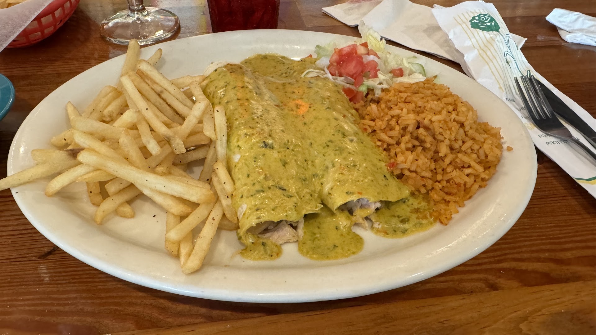 My favorite things were the creamy jalapeño, the chicka chicka boom boom, the green chile rice, and the kids mac n cheese. From the very first day we tasted the food, this was what I always ordered. The enchiladas were always loaded with chicken inside (ie the chicken went all the way to the edge of the enchilada roll) and the boom boom sauce (spicy queso) was poured on top and there was enough running down the sides to swirl the enchilada around in or mix in with the already spicy green chile rice.