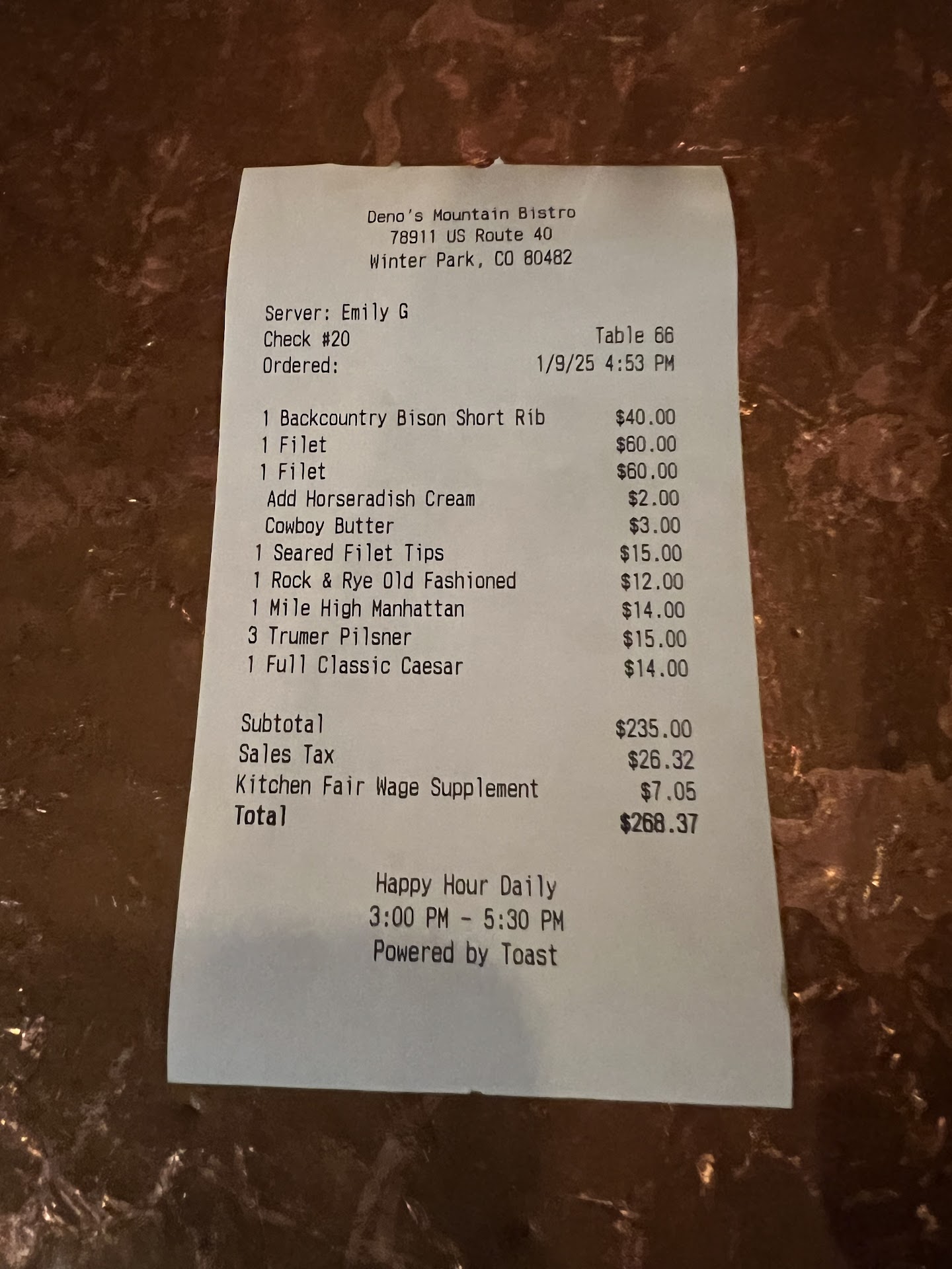 Unfortunately, we listened to a friend who has been telling us repeatedly that we need to eat at Deno’s. Now we are no strangers to Winter Park and love this town! We finally relented and decided to go. Let me say from the get go we were doomed as was every other patron tonight. We were told the only a available table would be outside or a high top. As it was on the chilly side we opted for the high top. This table was clearly an after thought placement and every staff member and patron who would walk by created what I can only describe as a heavy vibration there were times we thought the table and chairs with us there would fall through the floor. Not to mention the fact that this restaurant was so loud I don’t believe I would have heard a bomb go off. Our waitress was clearly scattered and her voice was definitely not an indoor voice added to our frustration. She took out drink order and we sat helplessly as our drinks died at the bar, ordering a simple Topo Chico and a draft beer seemed to be like asking her to perform rocket science to counter a nuclear attack. Getting a glass bottle with a lime in the hole was like getting a Corona on a bad beach and yet I am in Winter Park Colorado and apparently bringing a glass and ice is to much. Anna our waitress was clearly offended that we were sharing a French Onion Soup and a Burger, not being old enough to realize that you should not judge people, especially those older who probably tip well. We were brought cold soup that had zero seasoning and no one checked on us. Crazy because we told her we were going to want wine as well. In between the overly eager bread appetizer and our burger arrived a food runner setting our food down, you’d think this would be great except he was delivering food we never ordered. This happened not once, not twice but three times someone tried to give us food we didn’t order. The last time was hilarious as the check was right in front of me. The only time Anna was attentive was when we asked for the check and of course it was right in her hand. We asked for wine when our entree came and received it when we were 90% done. No one asked if we needed anything, there was no salt or pepper on the table. No one cared if we were in need of refills. It was a turn and burn type of atmosphere. For what we paid the burger was at best like warm and offering us onion rings without telling us there was an up charge is completely unprofessional. The fact our waitress had to tell us she was buried was even more insulting. Like we needed to make concessions for watching her flirt with people and give them more attention because their checks may have been bigger? We actually went to another restaurant for dessert and wine and were treated like royalty! Our check was less than $100 by a country mile but the service and atmosphere was so wonderful we tipped well over the check into triple digits. My advice stay away from Deno’s, the food and service are incredibly mediocre at best, and the atmosphere is horrible. Frequent other places where you will feel...