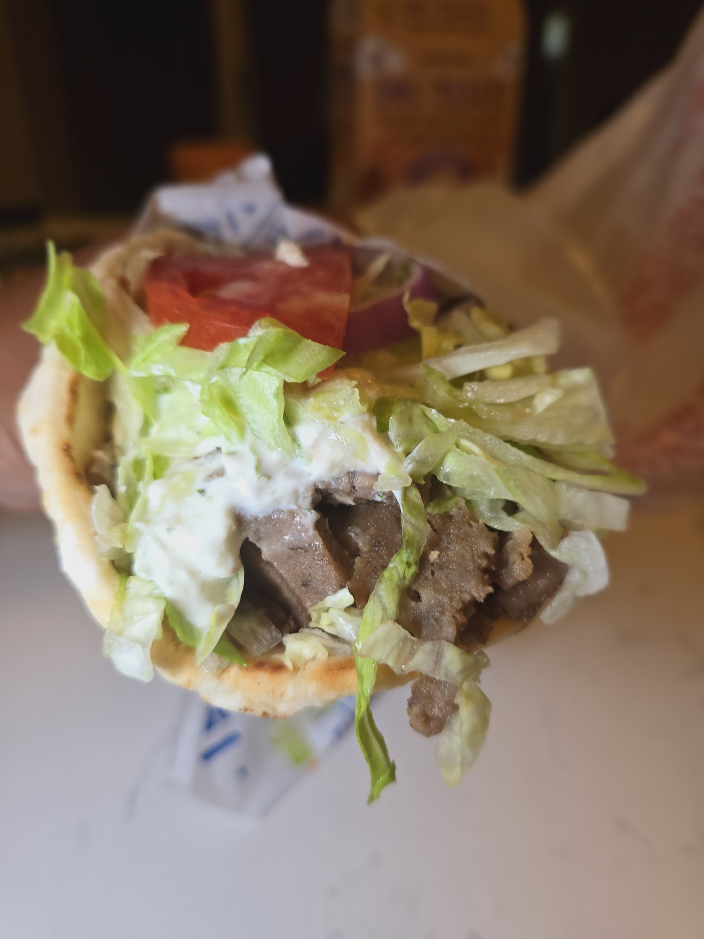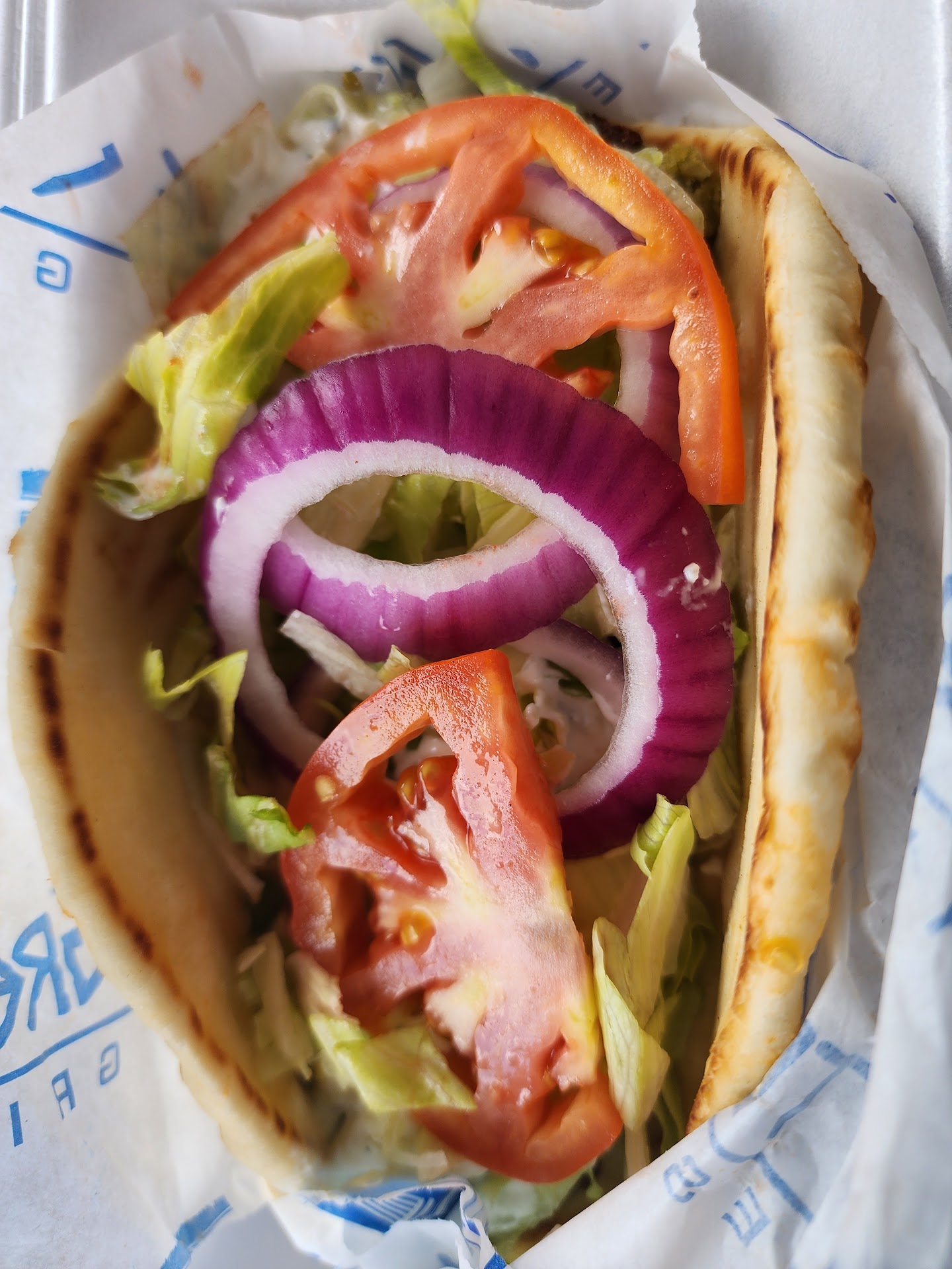 The Pita itself was sizeable. Weighing in at 1.09 lbs it would fill up most people. The Pita itself was a bit flaky and fell apart easily. I prefer it more doughy. The chicken in the gyro was a bit dry. The gyro was standard. The tarziki sauce was excellent and they put ALOT of it which I enjoy. Maybe that was to cover up the dryness of the chicken. The meat to vegetable ratio was 2/3 to 1/3. I usually crave more meat but would actually have preferred a bit more tomatoes and onions. Either than that with a bogo special I would definitely do this again. But for normal pricing I wouldn't.