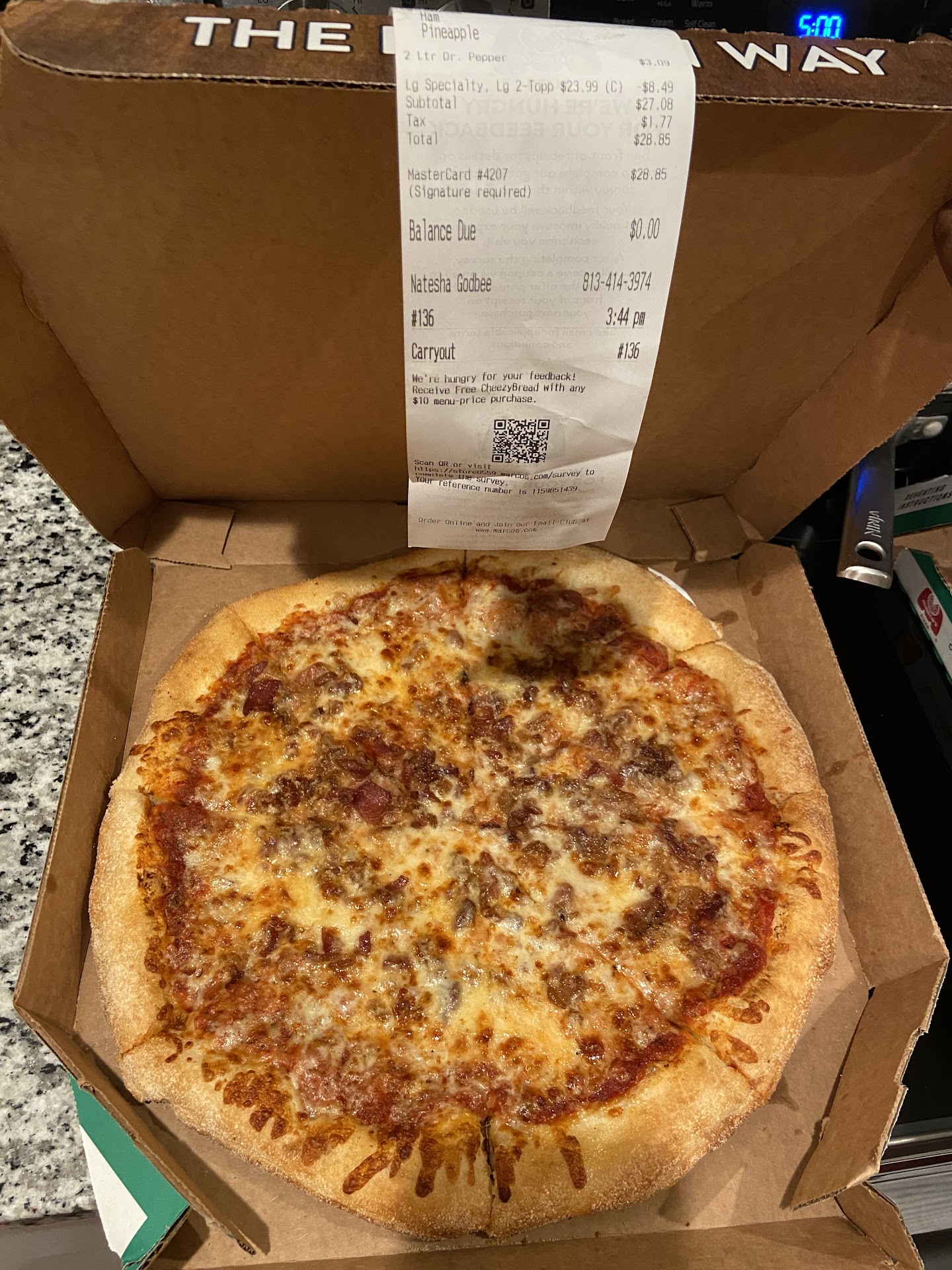 Read moreFood was okay but customer service was horrible. I ordered 10 pizzas, 1 sub and 1 pizza bowl and prepaid tip since I requested curbside service. I pressed the provided link twice and waited until 7 minutes after my scheduled time and walked in to find out what the delay was. Lady said how can I help you and I said I had a curbside pickup and was wondering of tge status. She says it's been done and tells worker that I'm here for the large order. Employee Chris proceeds to put the order on the counter for me to carry out myself. 11 boxes and a sub! I said we'll it was supposed to be curbside so can you at least help me out? He says well can't you see we're busy (there were two people waiting for their orders)? I said how is that my problem? He then carries out one stack and we head to the car parked one row over. He says you were supposed to park up here (every space was full) and I asked where he thought I should have parked with every space full? Where is the customer...