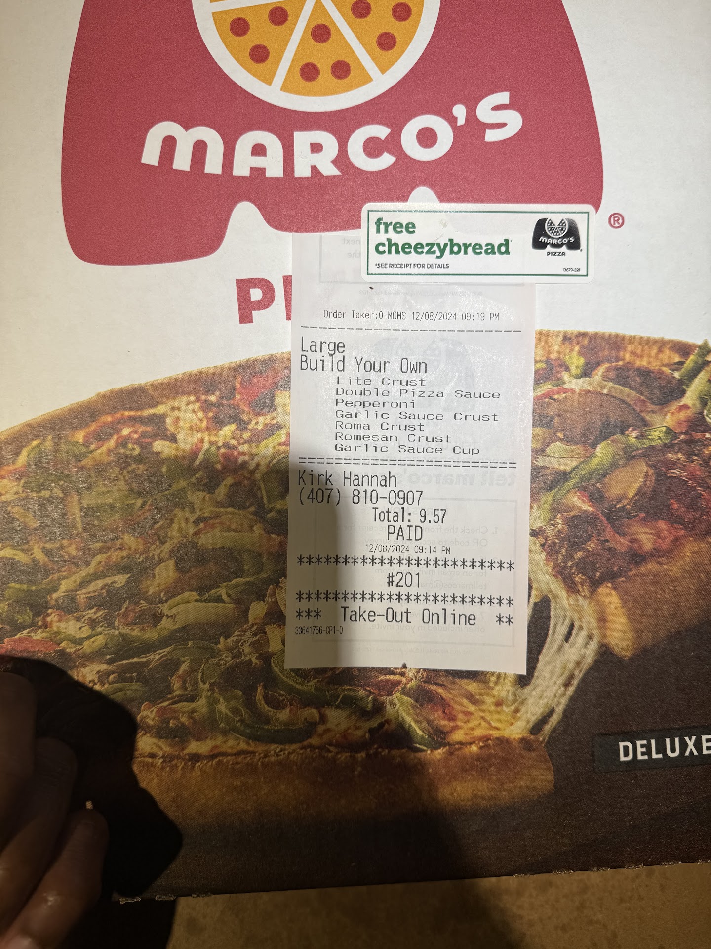 Read moreOrdered a medium cheese pizza with some add ons and a chicken caesar salad. Received a small plain cheese pizza and nothing else. Uber driver said it wasn't his problem and walked away. Called and manager said it wasn't his fault because he didn't pack it. No solutions, no nothing. The correct receipt was taped to the top of the box. So the person putting the order together made a mistake. The person who handed it to the driver made a mistake. The driver made a mistake. The manager made a mistake with his flippant attitude and nastiness on the phone. Had he just said "I'll make the right order that you paid for (even though I paid extra for delivery and tip) and just come pick it up" I would have. But nope. Hung up on me. This was my third order from Marcos. Once the pizza wasn't cut, and once the food was freezing cold. It's a shame, because the food is actually good. But I'll never order from here again, and I will tell everyone who will listen not to order from...