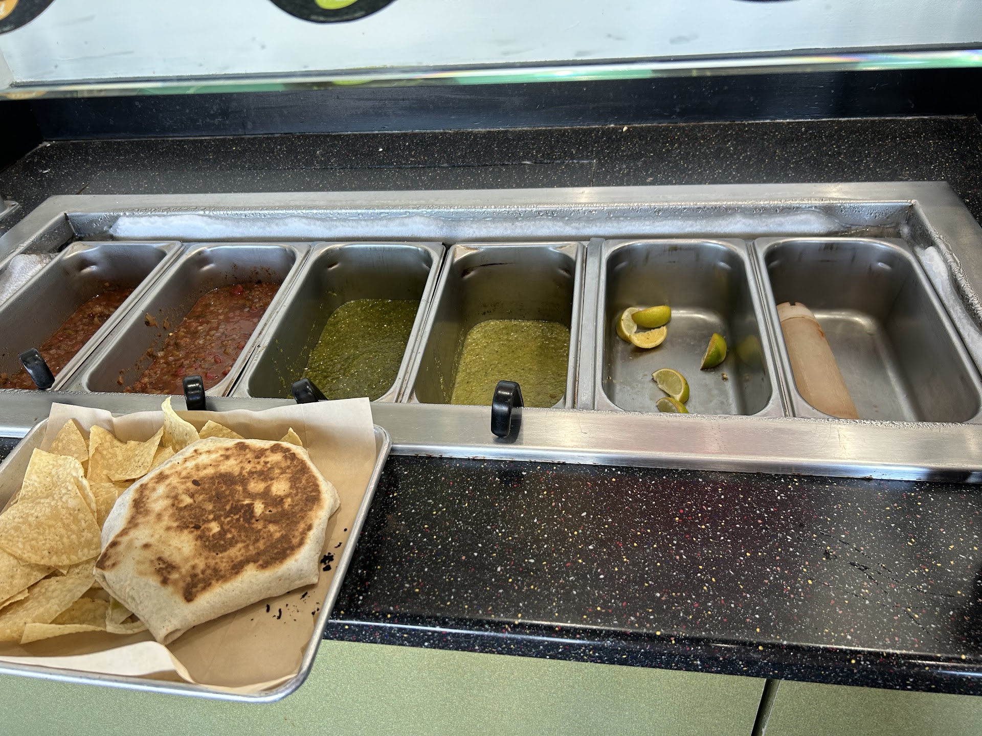 The only guy working the line was clearly new. I had the worst wrapped burrito Iâve ever had in my life. Messy and annoying but no big deal. Iâm sure burrito wrapping is an acquired skill and I couldnât do it myself. However, someone did need to teach him about portions. I ordered a side of queso (smallest size they offer for queso) and this man didnât even give me half a scoop of chips. I took it to go so by the time I realized, it was too late. But I basically had nothing to dip in the queso I bought. Everyoneâs entree is supposed to come with chips, but especially when you pay for a side of queso, youâre expecting chips. Other Moeâs I go to literally fill half the bag with chips queso or not. The chips I did get were stale too.