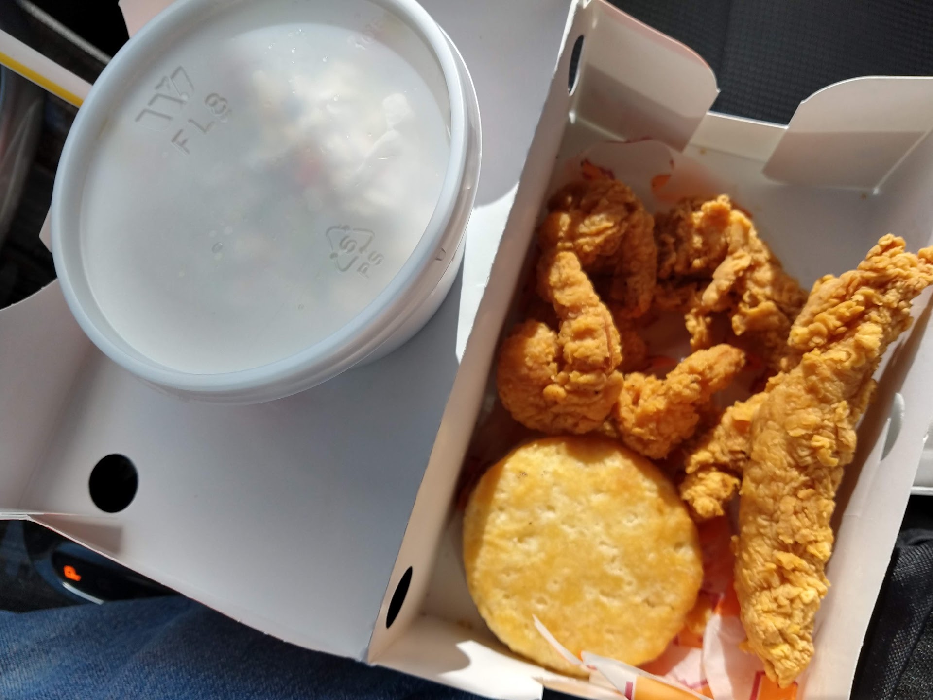 I drove off and went to eat my meal. When I took my box out of the bag I noticed it was fairly heavy. I opened it up and it contained 4 pieces of chicken. It just not was worth it to go back for something this inexpensive and at least I got spicy. The chicken was good and prepared right and my drink was right.