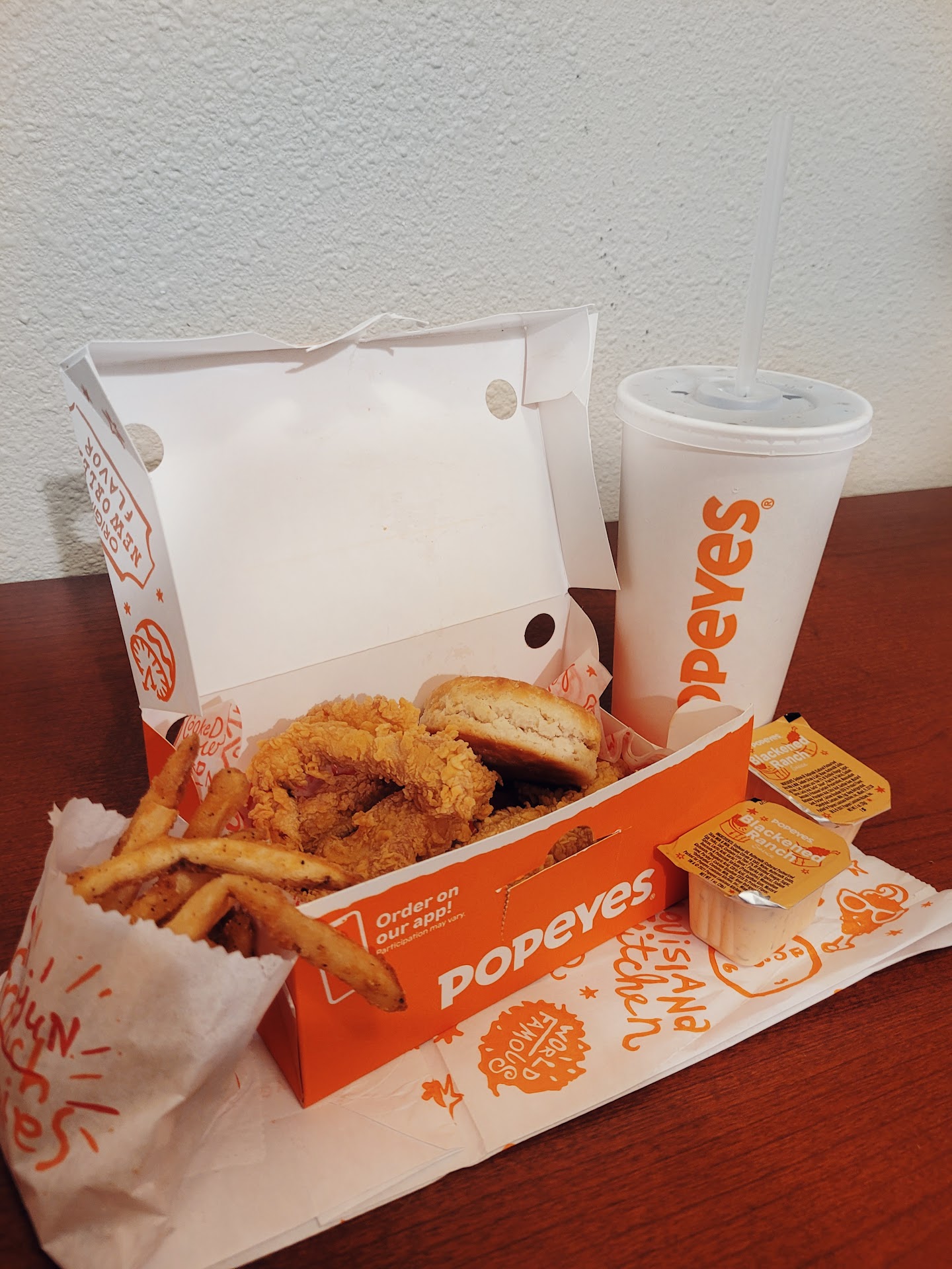 April 2019 - I'm not sure why I punish myself like this. This was my second time here using the drive-thru and once again I am not happy with my order. Last time they gave me the complete wrong food but it was comprable in price to what I ordered so I ate it. This time I ordered the surf and turf combo which I got at another location once before and they got my order wrong. This time I got about half as much food as the last time. The shrimp are not butterflied shrimp which is what it calls for and they were very small and the chicken tenders poor pitiful in size. The only thing they got right on my order was spicy for the chicken, the biscuit, my coleslaw and drink. When I ordered I had to ask twice to get my drink because they never asked what I wanted. At the window they took my payment and then walked away. There was no cocktail sauce for my shrimp and they never asked if I wanted anything in the way of other sauce for the tenders or honey or something for the biscuit. They just walked away without giving me any chance to even ask.I believe this was my last trip to this location. If I want Popeyes I will go to one of the two that are about 15 miles from my house that always give me good food and good service. The only reason I don't eat at Popeye's more often is they no longer have onion rings and I loved their onion rings.