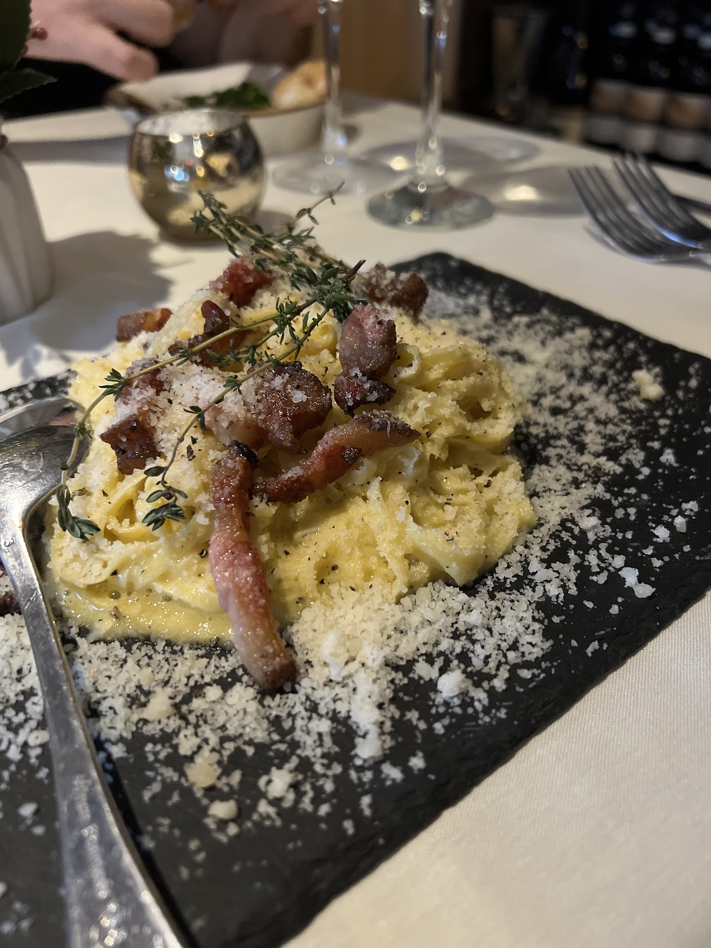 I do not know how to explain the pasta. It had the consistency of thin egg noodles… which made it clump and stick together and taste like paste. The plates, although pretty, did not do the pasta dish any favors. It was difficult to scoop and twist the pasta and sauce together, as the food was just placed on that flat service, making it spill onto the table. A pasta bowl would have been more appropriate. The overall unforgiveable flavor of the noodles made it hard to even taste the little bit of sauce that was sitting on them. The guanciale was perfectly cooked, though I thought there was too much pepper. That might be a personal choice, but traditionally that peppery flavor is reserved for Cacio e Pepe and Pasta alla Gricia, not Carbonara.