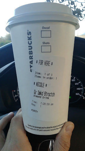 Read moreHORRIBLE. This Starbucks was absolutely the worst I’ve been to. Pulled up to the window first with the man talking like a robot as he can not find our order. Then once he finds it we pull up to the window and he gives us the drink. Two of the orders had cold foam on it and the cold foam was as big as a quarter in the middle of the drink. Told Alex and Eva that there was supposed to be cold foam and they said its just how its made…. Then once i got all pf my drinks i realized i didn’t have one of the food that i ordered. Went back to store to get it and a girl at the front was standing at the register named Alexis. When i walked up to the register she ignored me and then once i said hello she looked up with an attitude and said “give me a second” i said okay as she sat there and ordered a ham croissant and laughing with coworker Alex. Then she walked away and then Alex had to help me. I feel like i wasted my money here I wish I could have just gotten a refund or never ordered here in the...