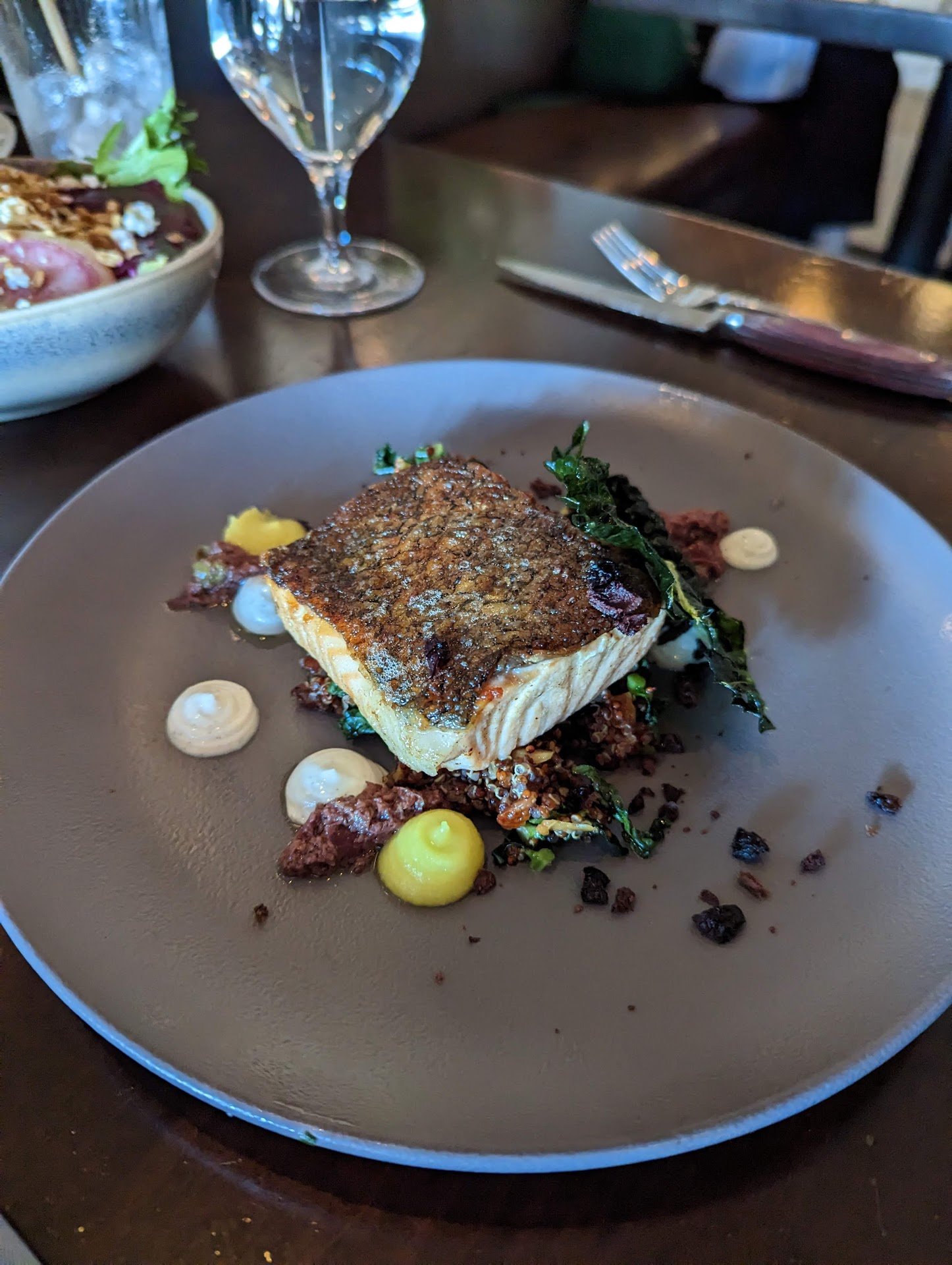 Server was very nice and answered a ton of our questions. However, if the menu was a little bit more descriptive, we wouldn't have had so many questions. There's a lot of terminology and unique food items that don't really tell you what's in the meal or the type of item that you might get. One example was one of the chicken dishes. It doesn't say whether or not it's a bone deny item if it's boneless if it's a chicken breast. If it's a quarter chicken, there was no explanation. That being said, at least we had good information from the waitress. The unfortunately a flight of beer was spilled on our table so that wasn't so great but things happen. We did order several appetizers, all of which were good though I was a little bit surprised that there wasn't something else that came on the table or with the meal. Such as there is no small amount of bread that comes on the table and there's no salads that come with the meal. I ordered a New York strip steak meal and it comes with fries. Now that's kind of a unique option, but they were some of the best fries I've ever had and it was a huge amount of fries. Though I probably would have taken half of that to have a side vegetable or a very small salad that came with it. Considering it was more than $30. The muscle dish had a lot of muscles in it. The shrimp tacos looked really good which somebody else at our table ordered. The one slightly disappointing meal was that the salmon that was ordered was very small. The place does get quite busy. So reservations are highly suggested. The one thing about ambiance is the place can get a little bit noisy. And if you have a table by the window, you're pretty much looking at a lot of car traffic whizzing by. I also did notice for a place that's on more of the mid upper end of price ranges for meals that the way people dress was not as appropriate as I would consider. Most people had the regular mid-range type of casual clothing and that seem to be the norm but seeing some people come in with athletic shorts like they just got off the ball field with what looked like soccer shoes and knee. High sports socks just looked a little bit out of place but that's just my opinion. I figure if I'm going to spend a minimum of 30 to $40 for one meal plus appetizers and drinks etc. And it's going to end up costing you more than $100 for a couple that people would dress like they're going to a nice restaurant. But I might be old school. Other than that, the options were unique and there were some pretty awesome flavors. We were offered a choice to see what a dessert menu would be, but I was actually surprised it wasn't already on the menu so you can kind of figure out what you might like for the evening. All in all we would go again but since it's an hour for us to get there, it's not some place we're going to frequent often but so glad we went.