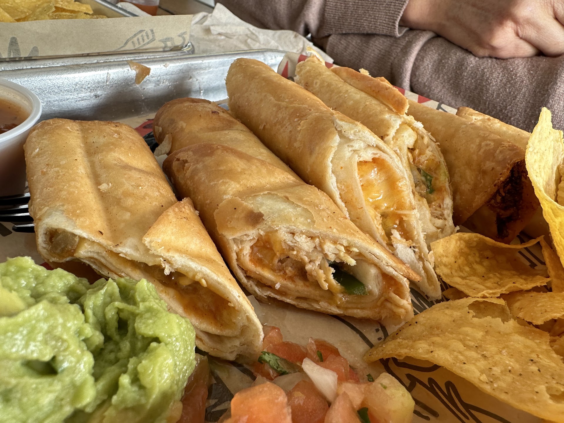 What I got a Tijuana salad, I customized this item. I selected black beans, refried beans with none of the dairy toppings (cheese and sour cream) and didn’t add any meat option. Basically the vegan version. It was a decent portion and it was very filling. I got a service of chips with it and a salsa. My friend and I also got the limited time flauntas. These were very soft and crispy at the same time!