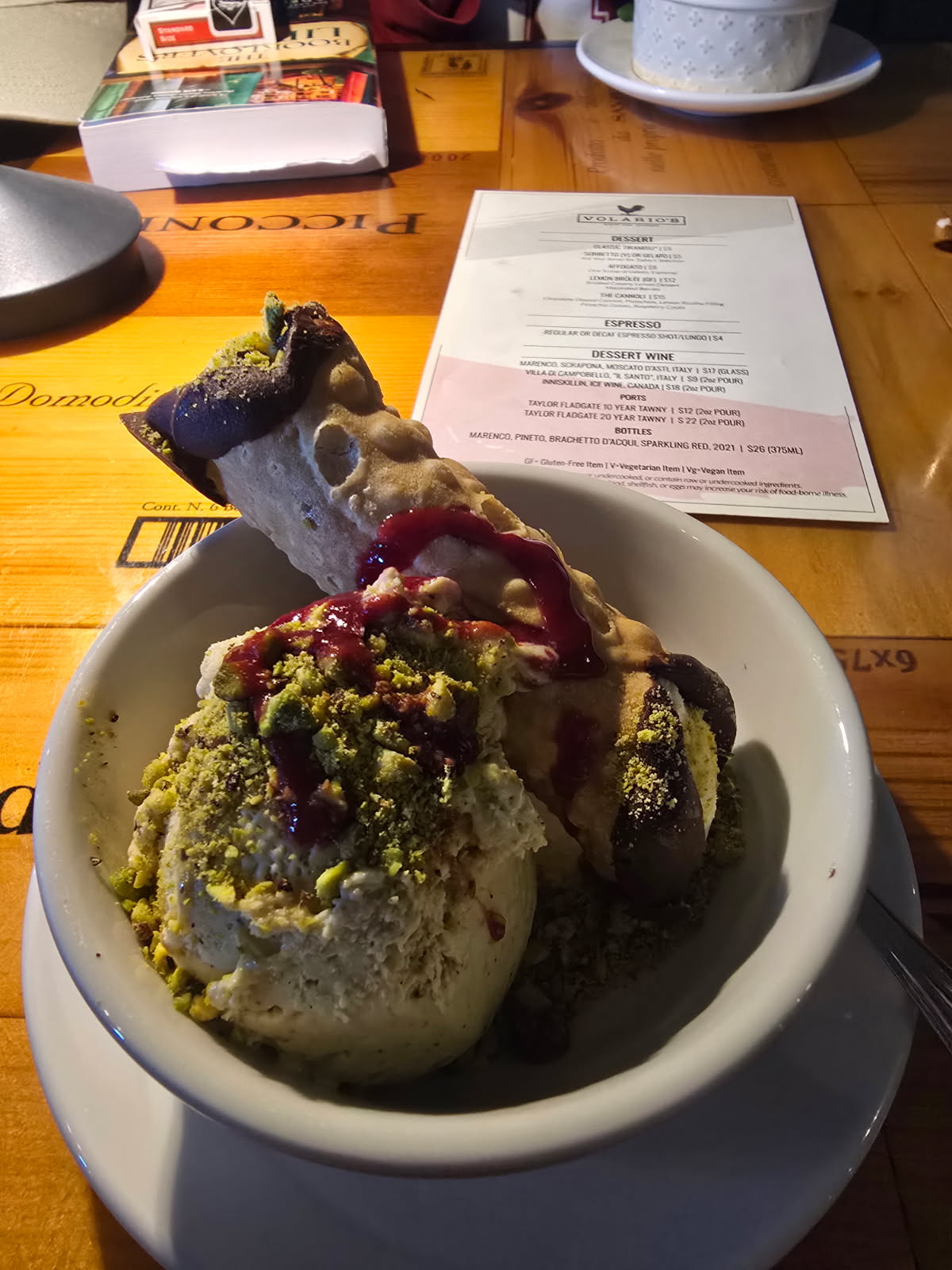 Read moreThis is a very special place for both an excellent meal and comfortable atmosphere when visiting the Winter Park area. While there are quite a few great dining options in the area, Volario's is our personal favorite for either a romantic date night or relaxed family dinner. The friendly service immediately makes us feel special, and both the inside and outdoor seating options are comfortable depending on the weather and mood of the occasion. Coming from the heart of Cow Country, we are no stranger to excellent beef, and many steaks around the country have disappointed our discerning taste. That said, the ribeye that was served with the house special at our last visit was the singularly most delicious medium-rare cut of beef I've ever enjoyed. From the lightly charred edges to the succulent red center, it was a beef lover's dream. The red wine recommendation from our server could not have paired better. My wife does not care for dry red wine, but she enjoyed two glasses of the Canvasback cabernet sauvignon paired with my steak and her mushroom pasta. You can tell that pride and discernment have gone into building the menus as well as the preparation and presentation of each dish. There is truly something excellent offered for just about any discerning patron. Lastly, save room for dessert as the options are the perfect capstone to a delicious dining experience. (My photo is of the cannoli, but my personal favorites are the tiramisu and creme brulé.) I hope you enjoy your experience here as much as we...